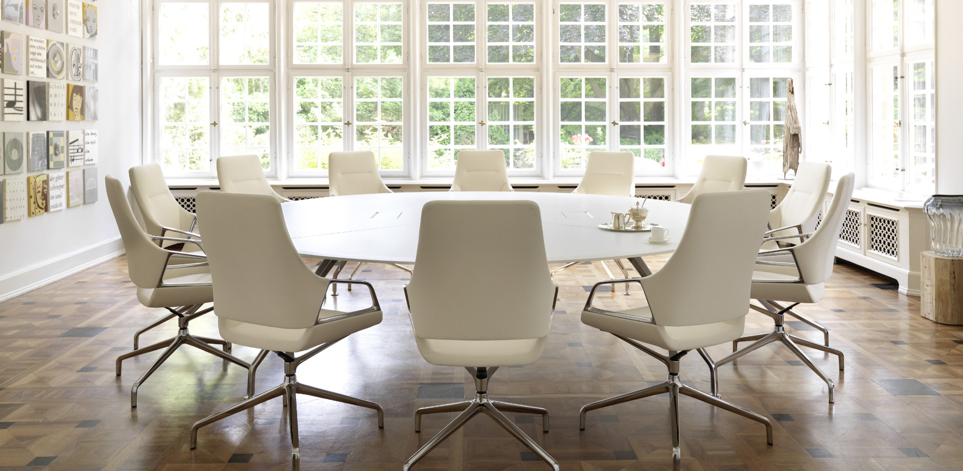 他的Graph反映了图表会议椅的主要设计特点。椅子的足部、扶手都可以在Graph会议桌上无缝反映出来。在桌子的框架上,铝的框架与倾斜的压铸铝腿和它们弯曲和扁平的外观相呼应。因此,在工作台框架上,灯线始终如一地出现,从而使框架具有无缝外观。巨大的跨度也给人留下了一种优雅的印象,引力似乎在那里几乎停滞了。这个ef fect是由不对称曲线的表边和表的圆角来增强的。