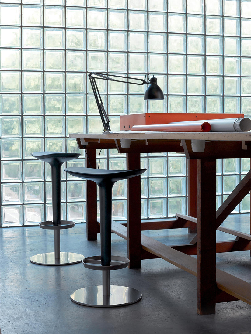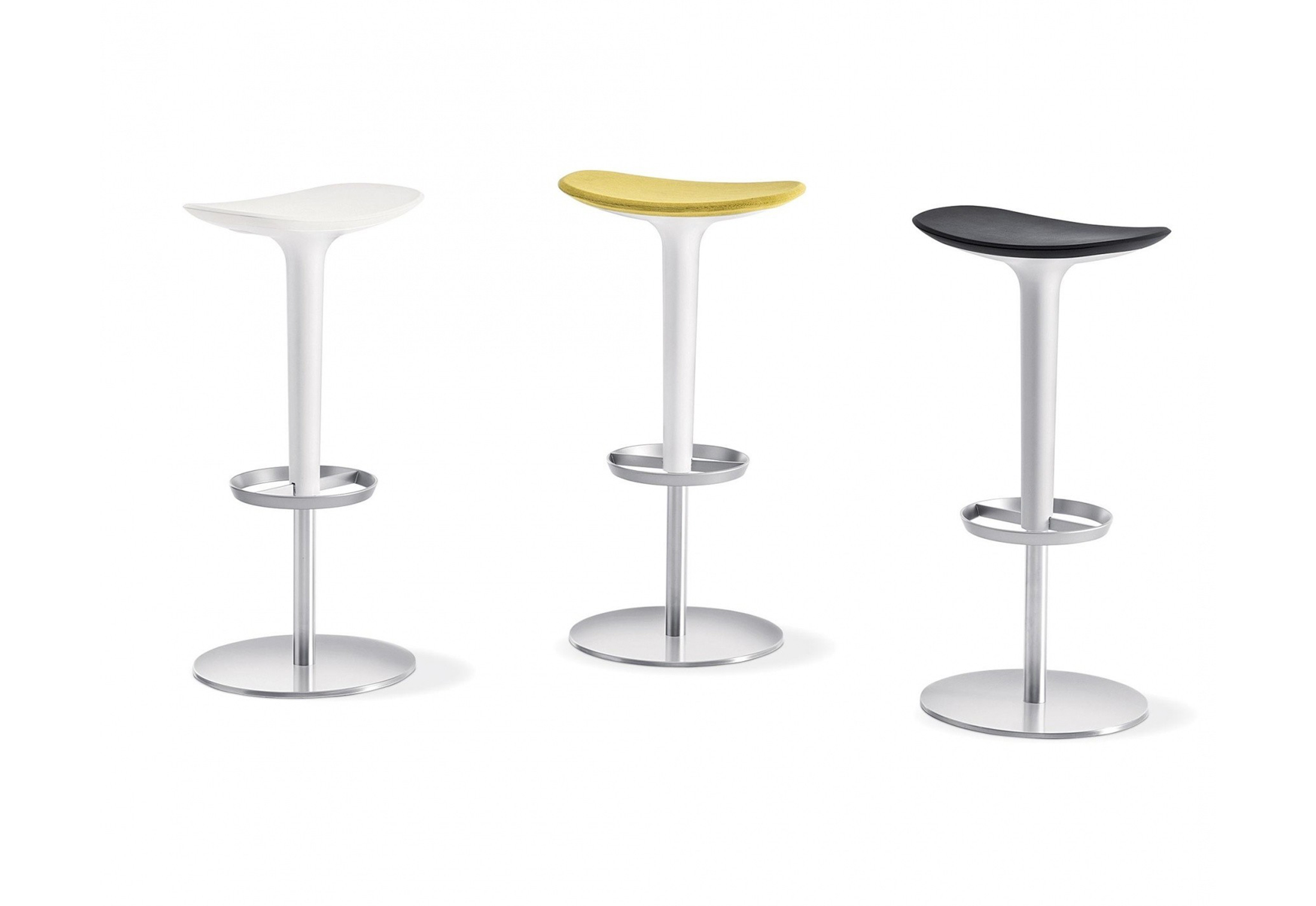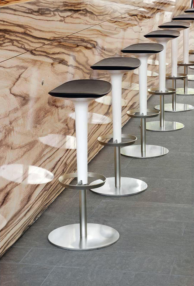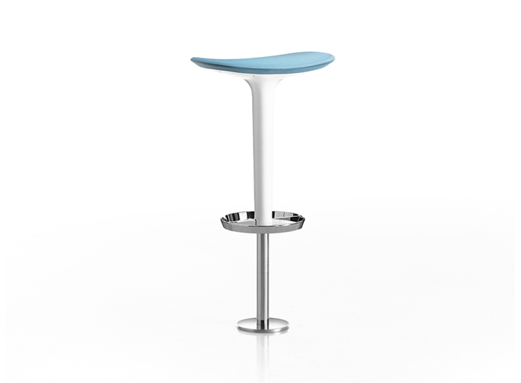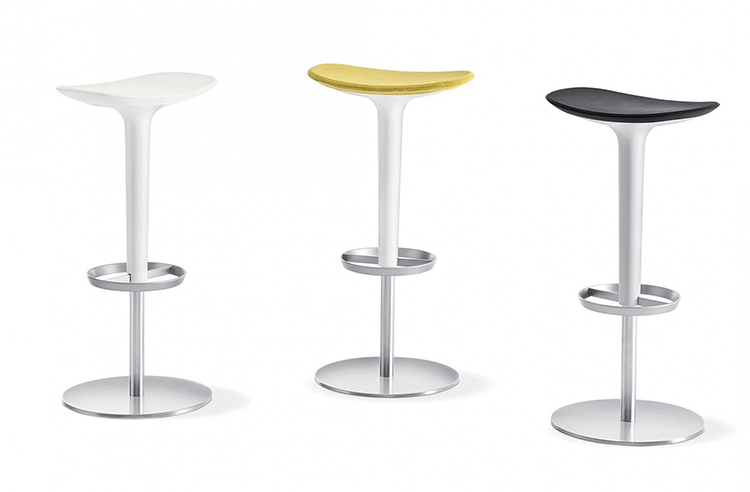 Babar凳子采用符合人体工程学的聚氨酯座椅制成,有多种颜色和双色组合。 软垫版本,座椅覆盖面料,皮革,人造皮革或客户自己的面料,配有靠背。 底座采用不锈钢制成,带有拉丝或镀铬表面,有固定,地板固定和可定制高度(65至77厘米)或高度可调的版本