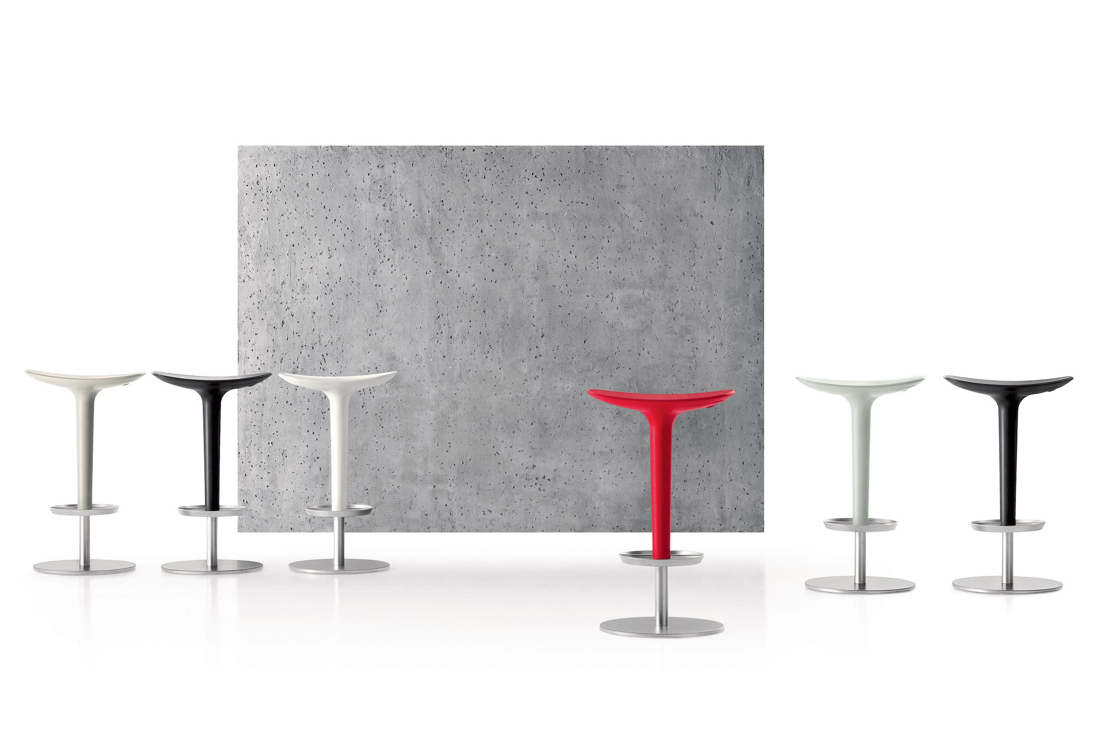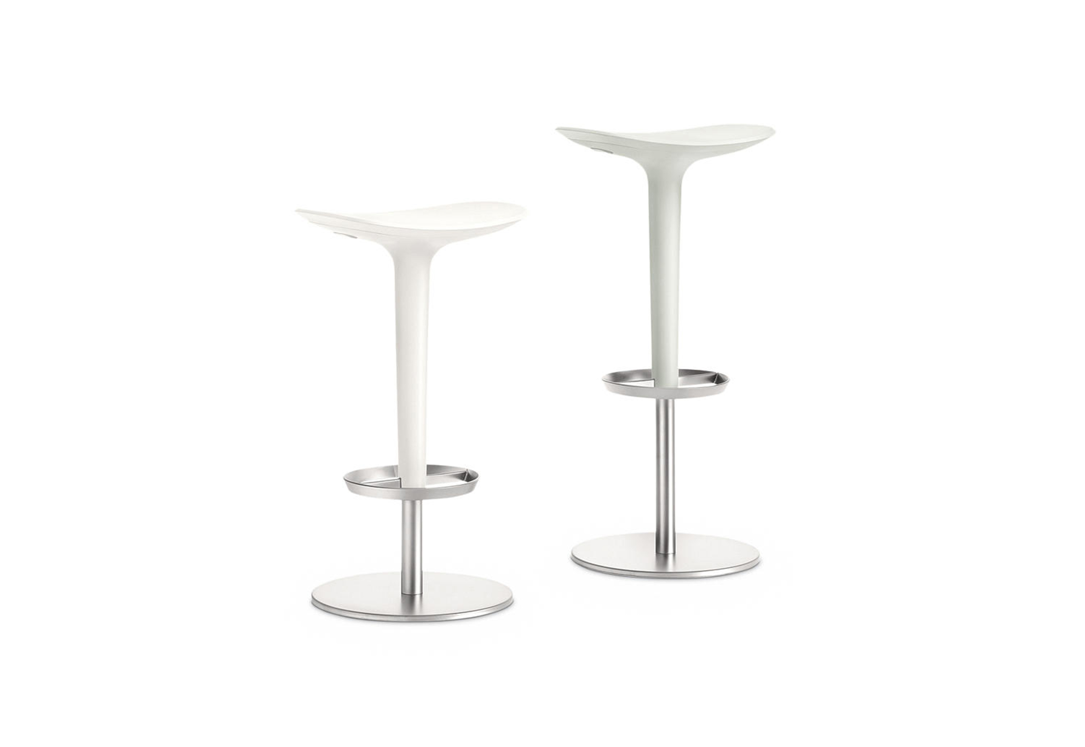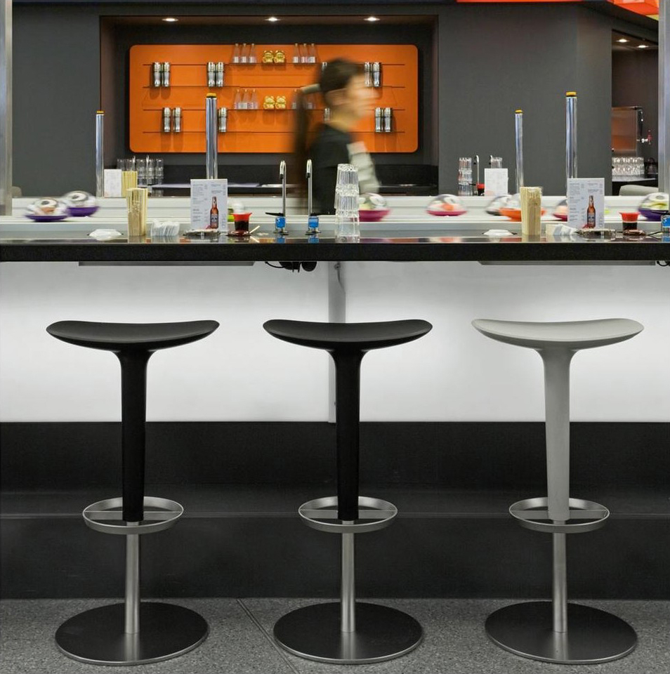 Babar凳子采用符合人体工程学的聚氨酯座椅制成,有多种颜色和双色组合。 软垫版本,座椅覆盖面料,皮革,人造皮革或客户自己的面料,配有靠背。 底座采用不锈钢制成,带有拉丝或镀铬表面,有固定,地板固定和可定制高度(65至77厘米)或高度可调的版本