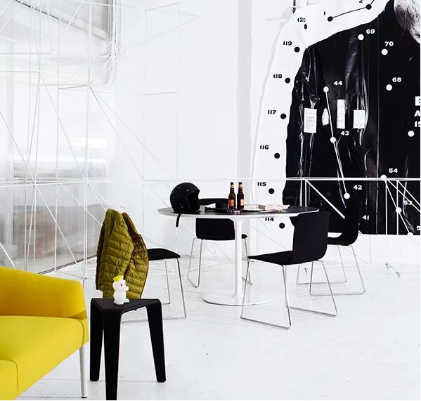 桌子有不同的桌面变化,高度(36厘米和44厘米)橡木,黑色和红色。 凳子有三种高度(44,64和76厘米)可供餐厅和酒吧应用,有两种颜色:天然橡木和黑色。