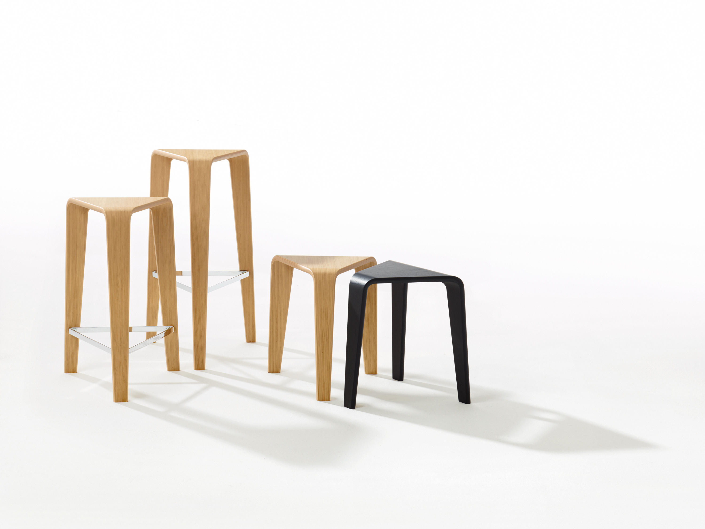 桌子有不同的桌面变化,高度(36厘米和44厘米)橡木,黑色和红色。 凳子有三种高度(44,64和76厘米)可供餐厅和酒吧应用,有两种颜色:天然橡木和黑色。