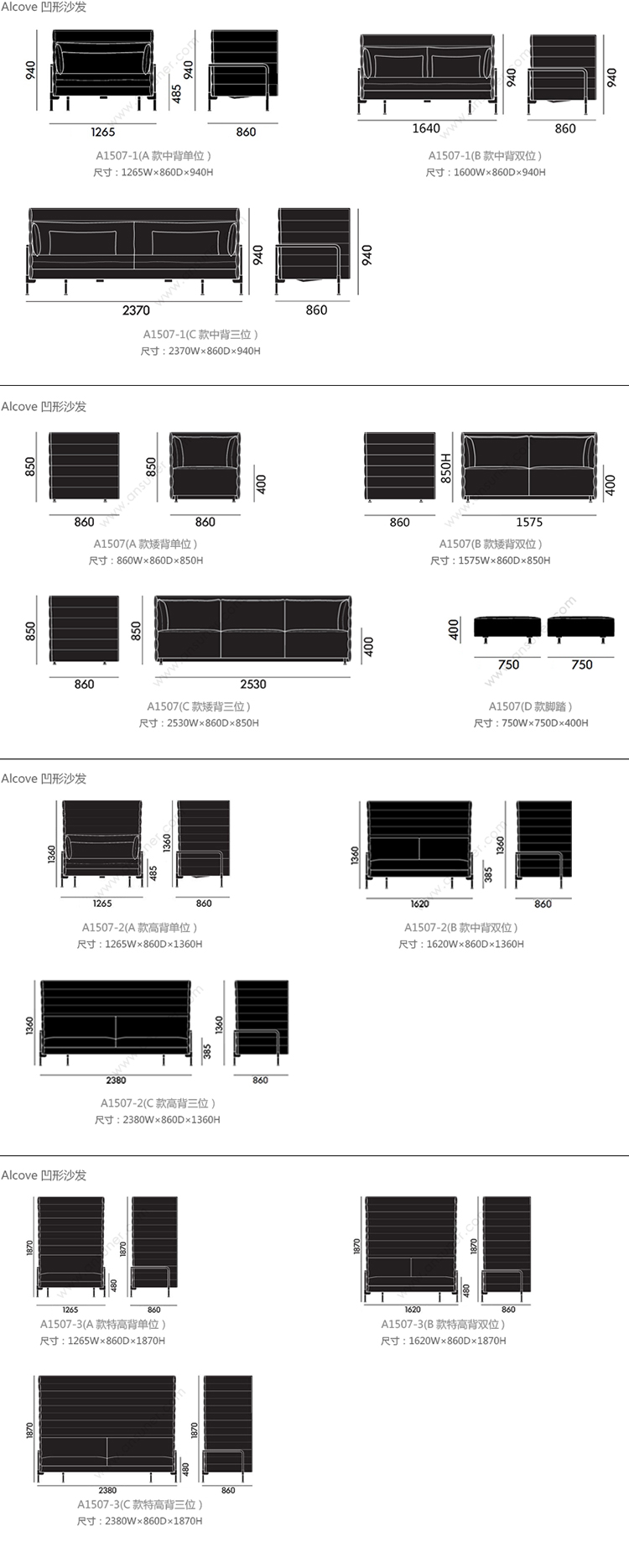 alcove 凹形沙发 系列尺寸/示意图