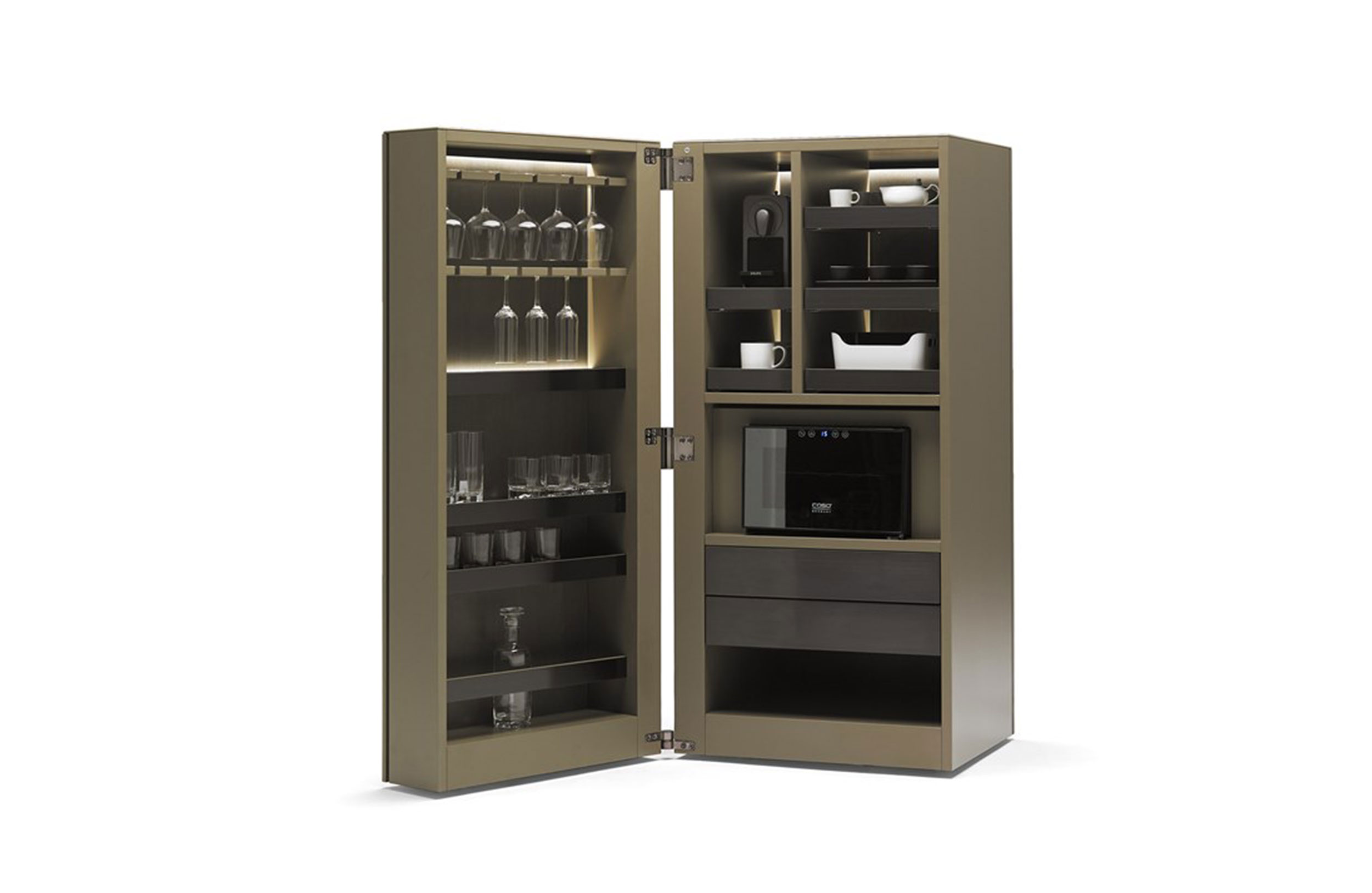 办公室厨房。一个隐藏必要厨具的柜子,可以适当地供应冷饮或热饮。配有Nespresso咖啡机和冰箱/酒架等电器。包括LED照明。表面处理:哑光漆的组合和木材