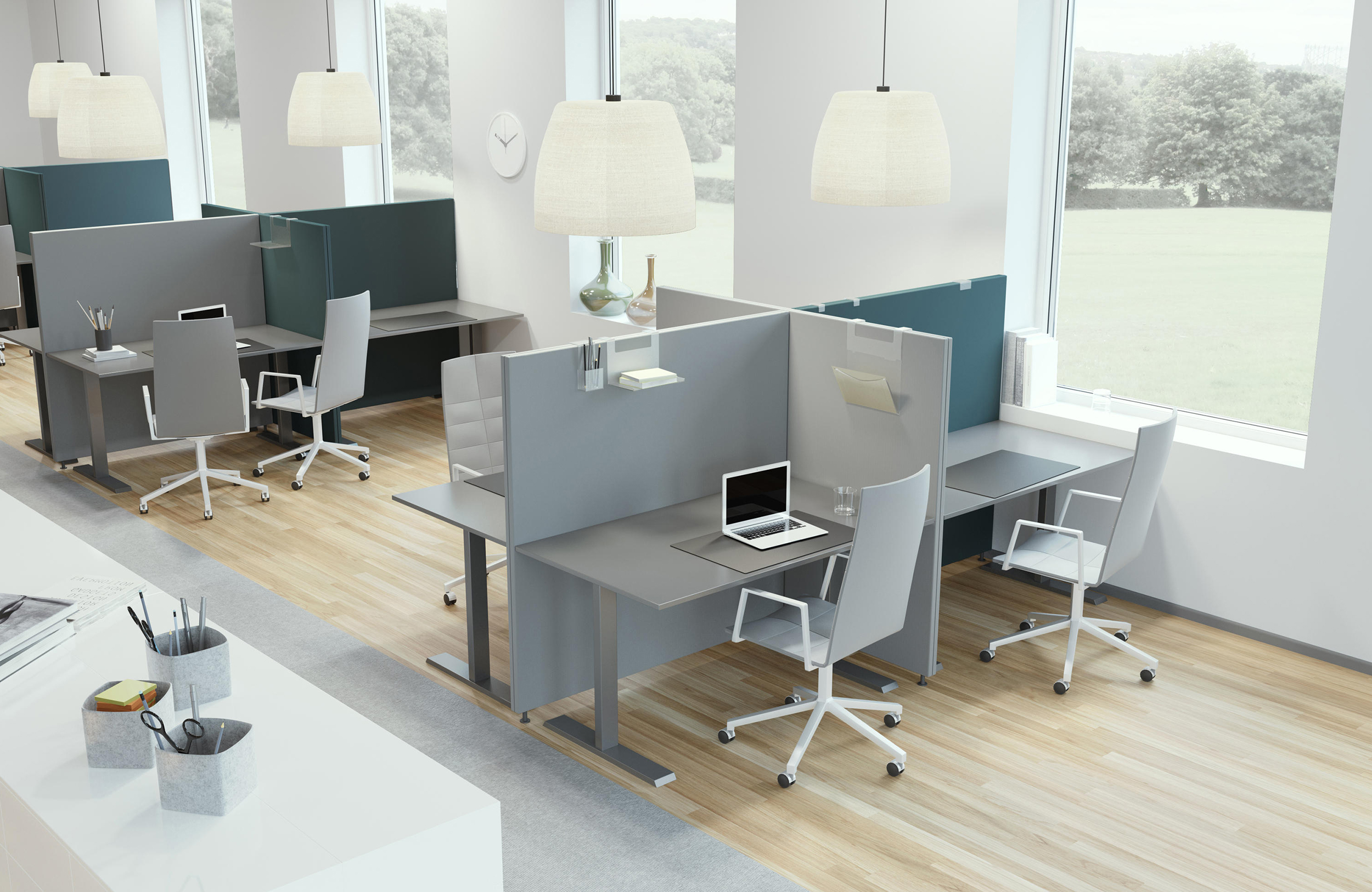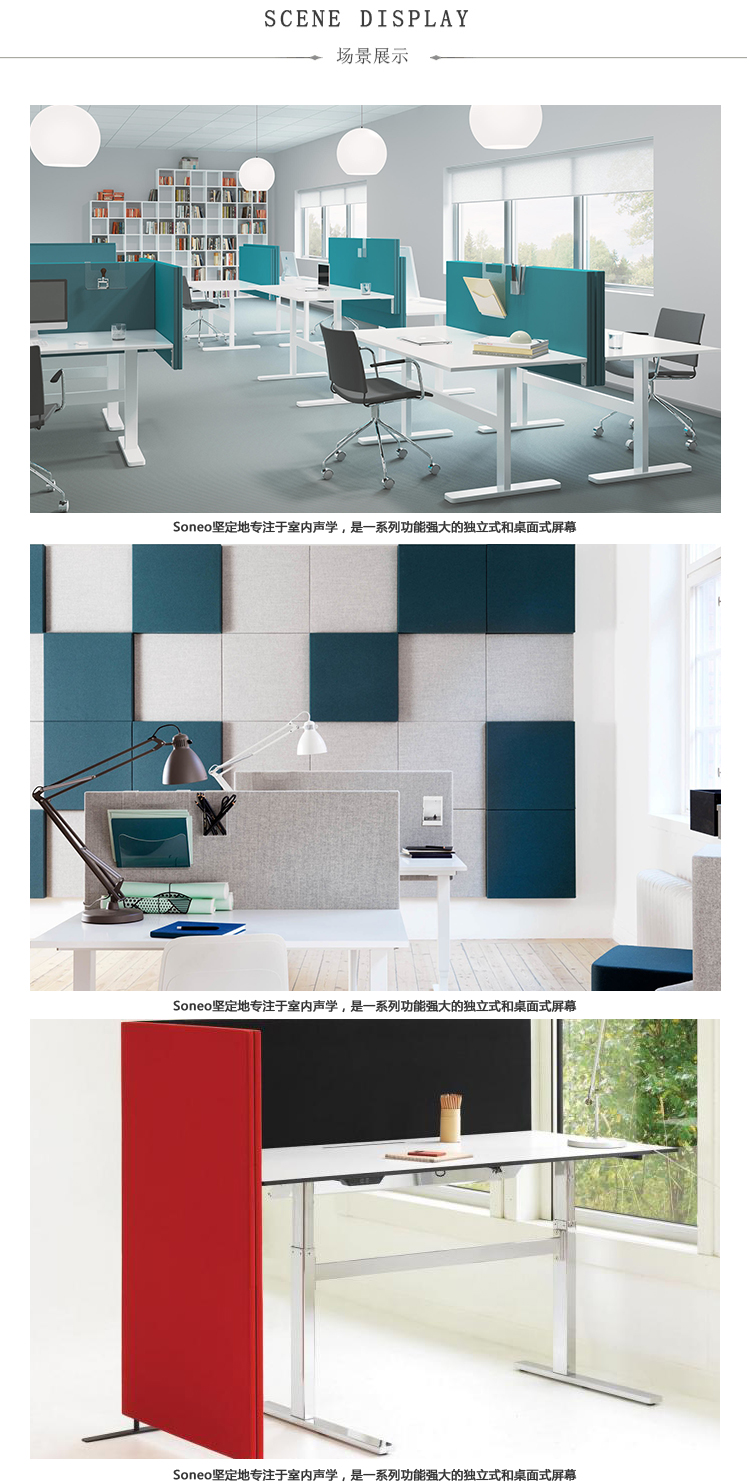 由于其直角,Soneo非常适合在开放式办公室内创建连接屏幕单元。它的吸音性能与各种颜色和标准面料相结合,意味着它是一种易于安装的最爱,融入工作场所。屏幕由安装在实木框架内的吸音填料组成。厚度:50mm。屏幕两侧都装有织物。金属支脚(颜色:黑色或白色),高度50mm。连接器允许多个屏幕连续连接在一起。