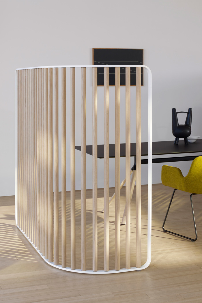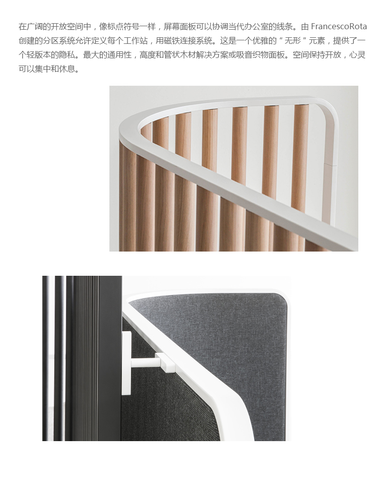 在广阔的开放空间中,像标点符号一样,屏幕面板可以协调当代办公室的线条。由FrancescoRota创建的分区系统允许定义每个工作站,用磁铁连接系统。这是一个优雅的“无形”元素,提供了一个轻版本的隐私。最大的通用性,高度和管状木材解决方案或吸音织物面板。空间保持开放,心灵可以集中和休息。
