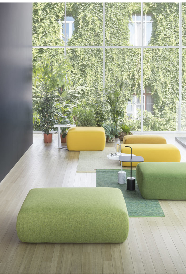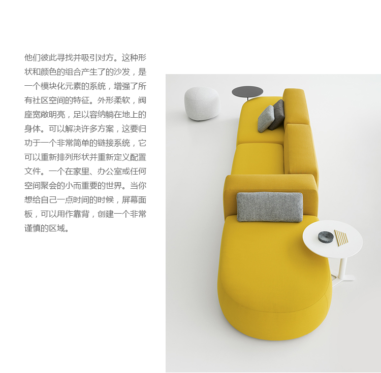 他们彼此寻找并吸引对方。这种形状和颜色的组合产生了的沙发,是一个模块化元素的系统,增强了所有社区空间的特征。外形柔软,阀座宽敞明亮,足以容纳躺在地上的身体。可以解决许多方案,这要归功于一个非常简单的链接系统,它可以重新排列形状并重新定义配置文件。一个在家里、办公室或任何空间聚会的小而重要的世界。当你想给自己一点时间的时候,屏幕面板,可以用作靠背,创建一个非常谨慎的区域。