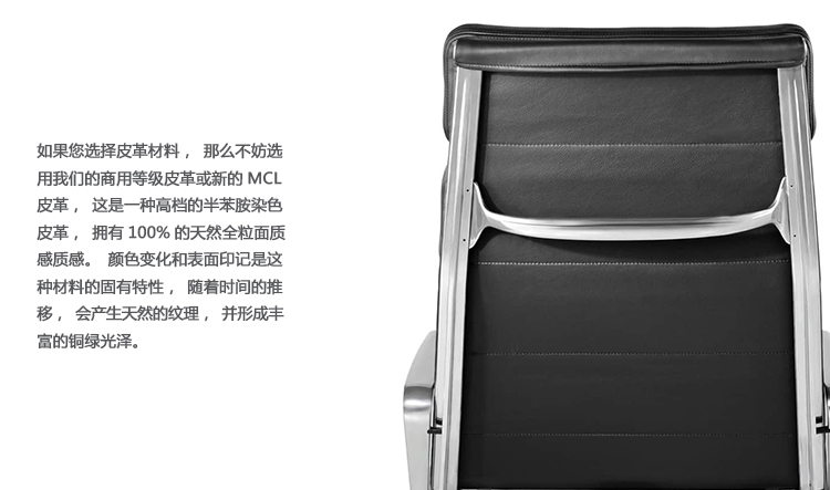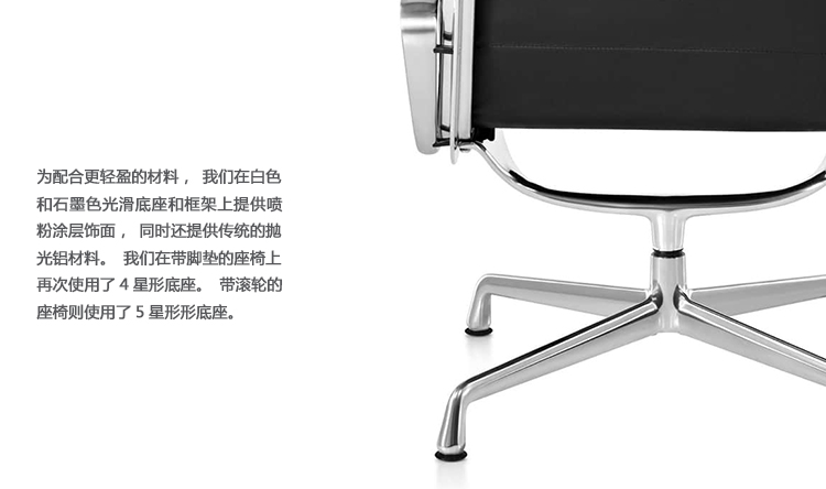 Charles与RayEames夫妇是20世纪最有影响力的设计师,卓越的设计涵盖了家具、建筑、影像与平面设计。他们从二次世界大战中美国海军的实验计画中学习经验并发展可谓是现今工业中使用模铸胶合版的先锋,这对设计界的超级夫妇档自1940年参与了由MOMA举办的有机家具设计大赛,自今已有近百件他们的作品被各大博物馆所永久典藏。Eames® Soft Pad Executive Chair(伊姆斯软包大班椅)是夫妻俩1958年设计的,是在全铝系列的基础上发展的另一系列Eames产品。舒适系列在全铝的椅架上增加了皮革制的柔软坐垫和靠背,高级铝合金制作,压模五星脚,可旋转。背垫和坐垫,采用西皮,具有透气性强,内部填充高密度定型绵,不易变形,不老化,依人体坐姿,符合人体工学,耐水及对人体无害等优势。椅子扶手选用优质电镀铝合金扶手,手感舒适,永久不生锈。转椅底盘为多功能底盘,可以保护使用者长时间坐用腿部健康,且作为高度可多定位调节。气压棒采用的气杆是正规厂家出产的外贸气杆,每一根气杆都有钢印,经过严格SGS检测的才可出厂,旋转、升降自如基本无声响,使用寿命长,可承受250kg,可升降数万次,将椅面调至与膝盖同高时,使用者坐下后双脚跟可垂直平放于地上,且大腿与地面平行,最符合人体工学理论,使用者长期久坐,也不想疲惫。办公椅脚为铝合金材质永久不生锈、承受能力强,安全更放心。椅子脚轮采用优质电镀片脚轮,耐用而美观,可以随意变换位置,贴心更方便,具有防震及防松脱,让椅子的安全性能更加可靠。