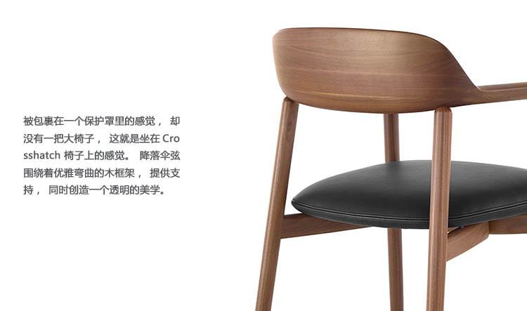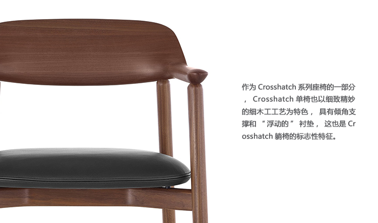 作为Crosshatch系列座椅的一部分,Crosshatch单椅也以细致精妙的细木工工艺为特色,具有倾角支撑和“浮动的”衬垫,这也是Crosshatch躺椅的标志性特征。单椅利落而精典的外形使其如同客座椅一样,在行政办公室和陈设考究的餐厅的餐桌旁都相得益彰。