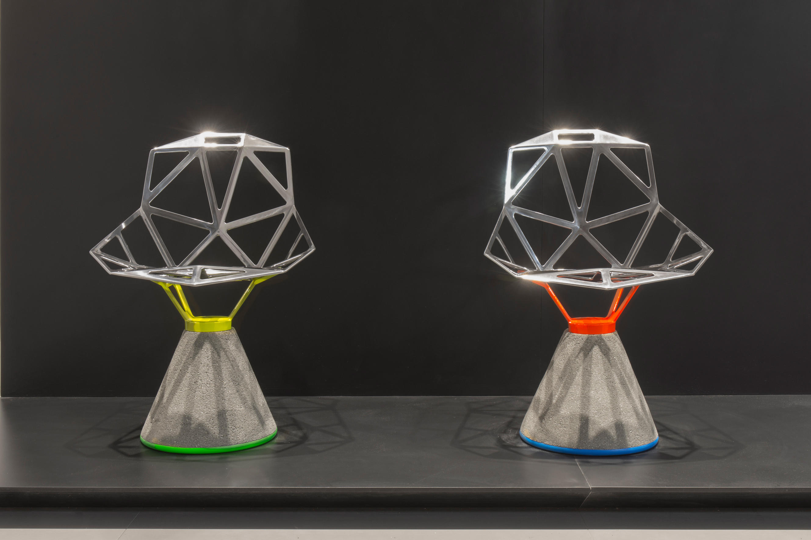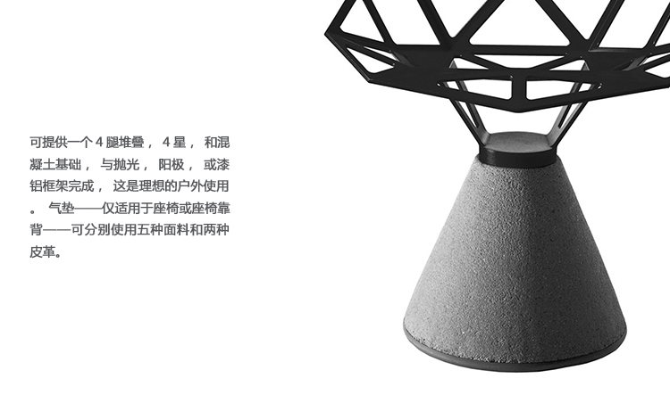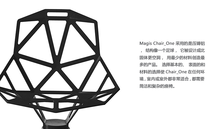 最受瞩目的德国设计师Konstantin Grcic 应邀为MAGIS 设计的Chair One(几何吧椅),是设计生涯中最具有标志的产品之一。办公椅体为模铸铝合金结构,经过氟化钛镀膜与塑料粉末涂布。椅子具有阻燃性、抗腐蚀性。适合室内及室外使用。以铝金属与钛金属制成的 Chair One,以多个平面以不同角度组合而成,建立起立体的外型。多个中空的三角型组合而成的座椅,不但令为用家带来强而有力的承托结构,而且还能在简单设计之中带出不一样的风格。这把椅子的惊人形象难免使人对它的舒适度产生疑问,但当你真正坐于其上,你会发现它实际上非常舒适,那些稀疏的网状结构能够极好地支撑不同体型的人体,后背上的把手也非常实用。当你知道Chair-One最初是被当作户外用椅而设计的,你会更加佩服Konstantin Grcic的缜密用心:极少的表面可以杜绝雨水,并且减少灰尘堆积,夸张的形态则令它能够在街道、建筑或自然的环境中拥有自己美学上的存在,而不是被环境所吞没。Konstantin Grcic花了三年时间设计Chair One,自2003年诞生以来,堪称Grcic精简主义风格的代表作。2006年,Chiar One为Konstantin Grcic赢得了德国政府的设计大奖。