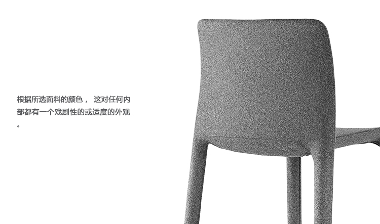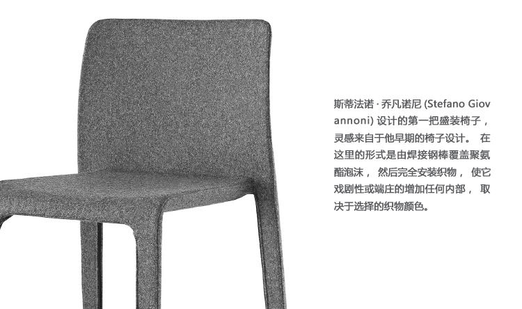 斯蒂法诺·乔凡诺尼(Stefano Giovannoni)设计的第一把经过修饰的椅子,灵感来自他早期的椅子设计。在这里的形式是由焊接钢棒覆盖聚氨酯泡沫,然后完全安装织物,使它戏剧性或端庄的增加任何内部,取决于选择的织物颜色。