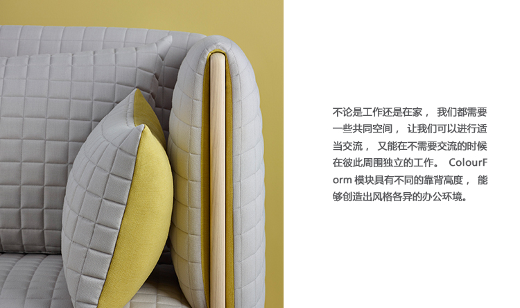 不论是工作还是在家,我们都需要一些共同空间,让我们可以进行适当交流,又能在不需要交流的时候在彼此周围独立的工作。ColourForm模块具有不同的靠背高度,能够创造出风格各异的办公环境。在需要隐私的时候,可以利用高靠背的独立组件隔断周围的环境,又可以用低靠背的模块创造出促进协作的配置。二者结合在一起,可以开创出各种有意思的地形或者引领客人穿过优雅的空间。