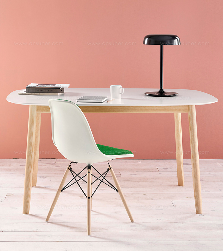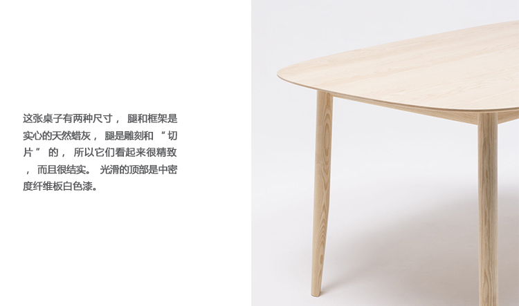 这张桌子有两种尺寸,腿和框架是实心的天然蜡灰,腿是雕刻和“切片”的,所以它们看起来很精致,而且很结实。光滑的顶部是中密度纤维板白色漆。