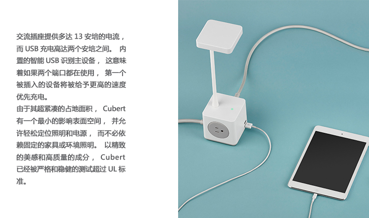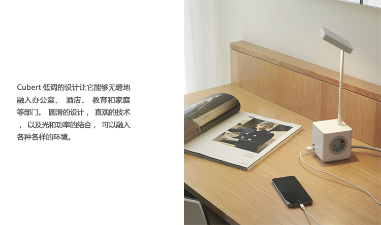 Cubert以集成的形式为个人设备提供电力——将光、USB和AC电力的配置考虑在内,这比以往任何时候都更加紧凑,因此它更容易使用并且占用更少的空间。