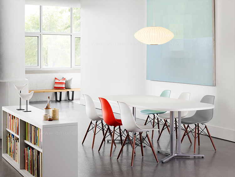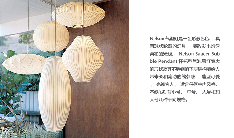 Nelson气泡灯是一组形形色色、具有球状轮廓的灯具,能散发出均匀柔和的光线。Nelson Saucer Bubble Pendant杯托型气泡吊灯宽大的形状及其不锈钢的下层结构能给人带来柔和流动的线条感,造型可爱,光线宜人,适合任何室内风格。本款吊灯有小号、中号、大号和加大号几种不同规格。George Nelson于1952年设计了这个系列的灯具,当时他偶然发现了一款瑞典吊灯,打算买回去放到自己办公室里使用。但那款吊灯高昂的价格让他犹豫了,却让他萌生出自己设计一个气泡灯系列的念头来。