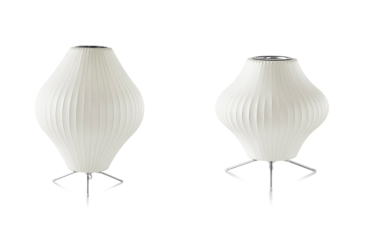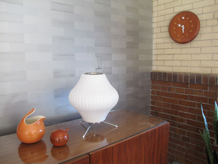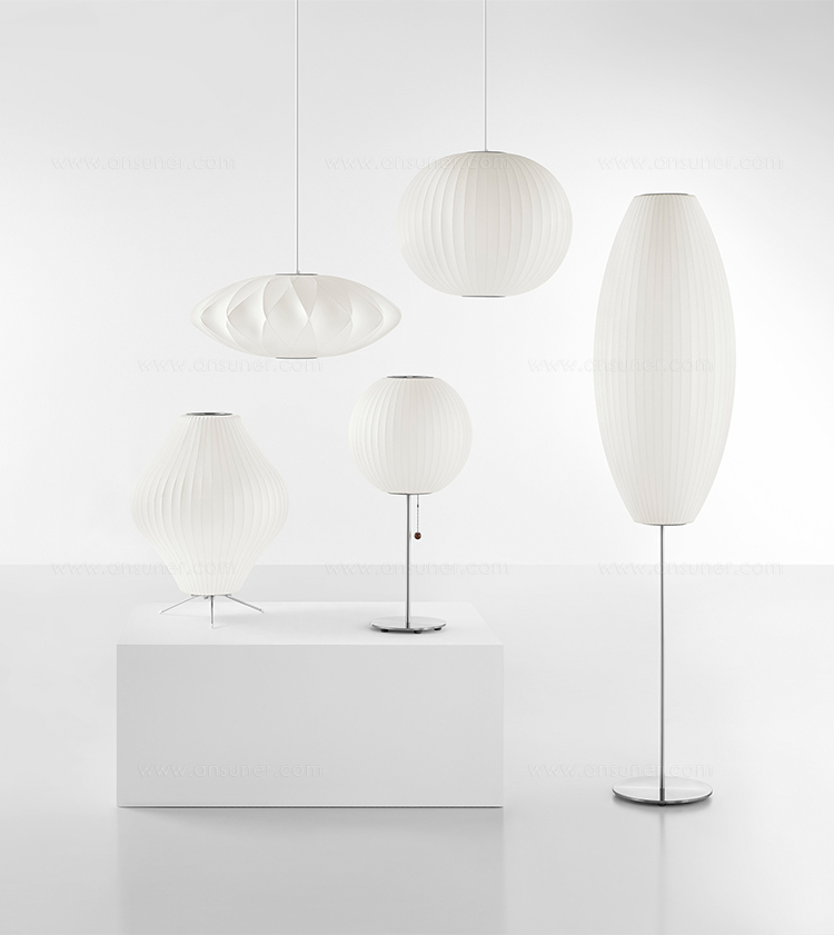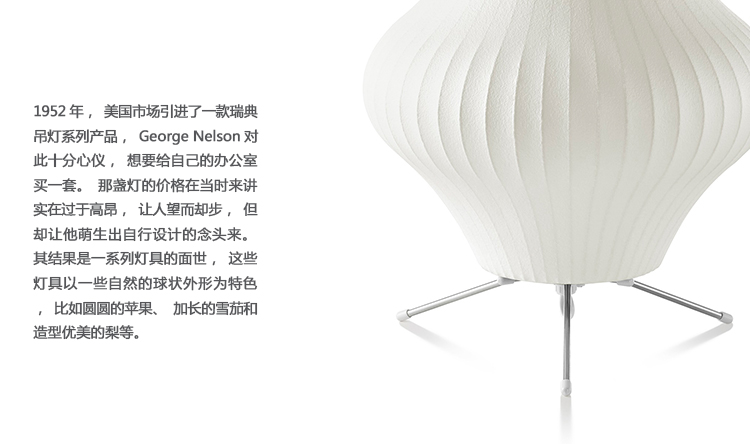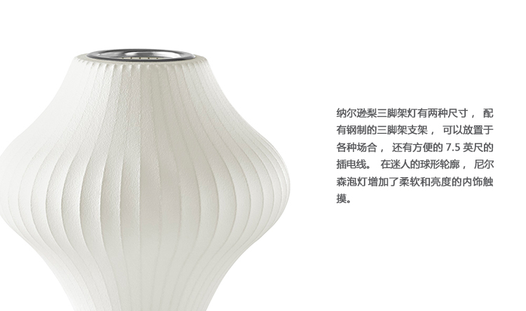 纳尔逊梨三脚架灯有两种尺寸,配有钢制的三脚架支架,可以放置于各种场合,还有方便的7.5英尺的插电线。在迷人的球形轮廓,尼尔森泡灯增加了柔软和亮度的内饰触摸。1952年,美国市场引进了一款瑞典吊灯系列产品,George Nelson对此十分心仪,想要给自己的办公室买一套。那盏灯的价格在当时来讲实在过于高昂,让人望而却步,但却让他萌生出自行设计的念头来。其结果是一系列灯具的面世,这些灯具以一些自然的球状外形为特色,比如圆圆的苹果、加长的雪茄和造型优美的梨等。
