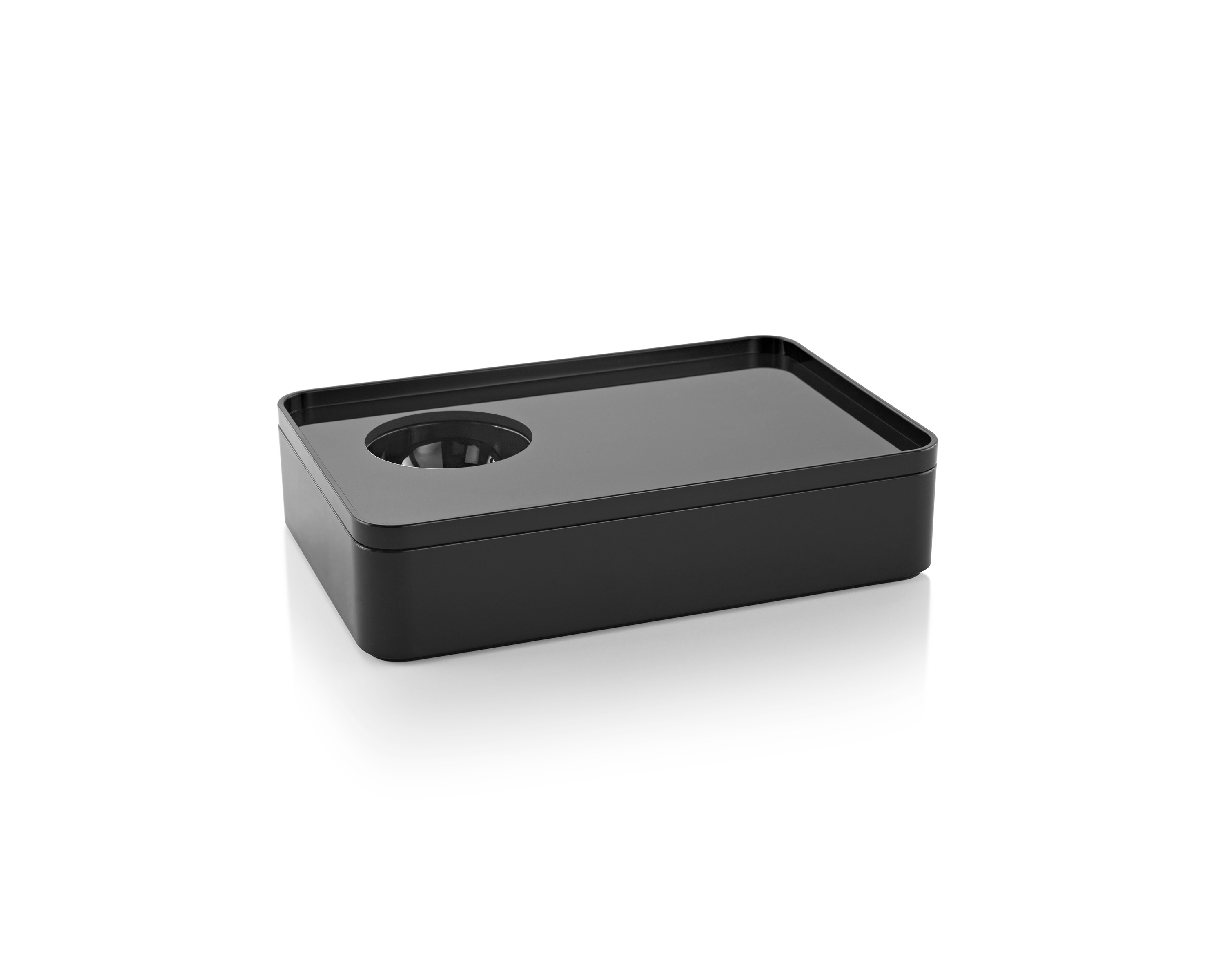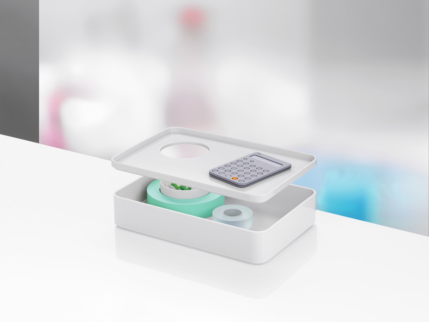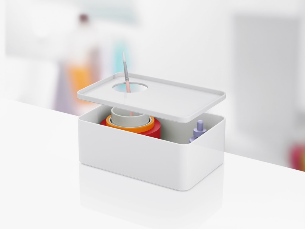 考虑到占据家庭及办公室空间的笨重物品的存放问题,Sam Hecht和Kim Colin设计了具有可拆卸盖子的储物盒。每个盖子上设计有孔洞,可供放置移动式笔筒。或者,笔筒可固定于储物盒内部孔洞下方压槽中,从而在无需打开盖子的情况下便可接触杯中物品。