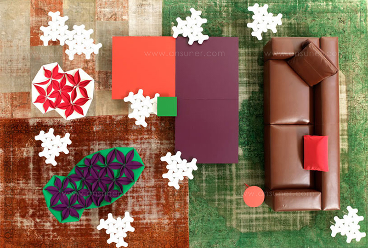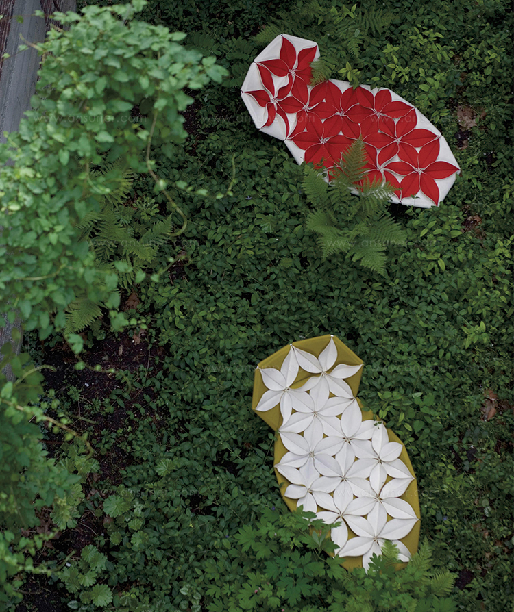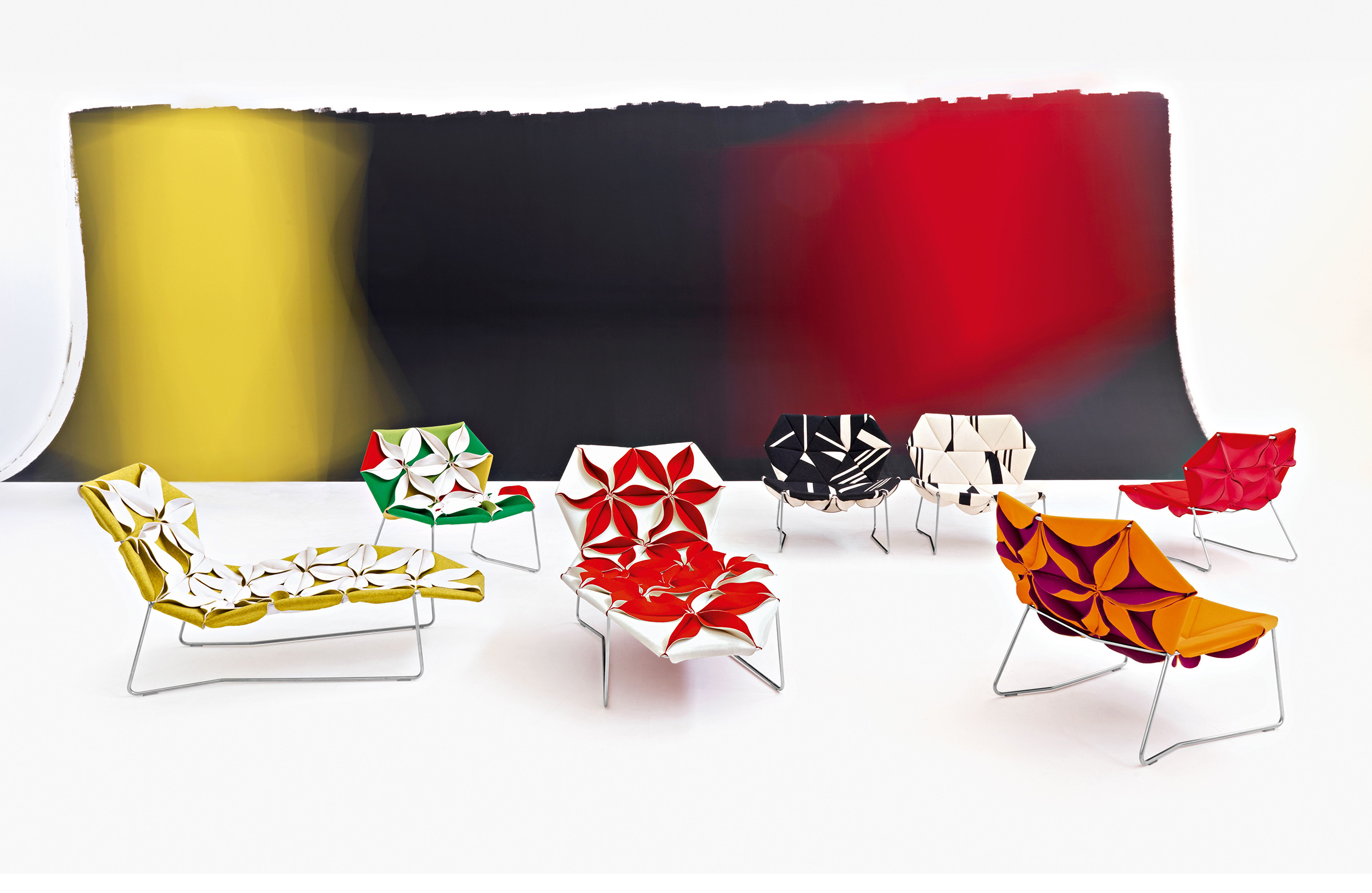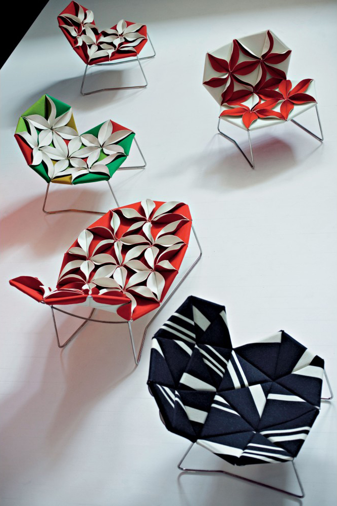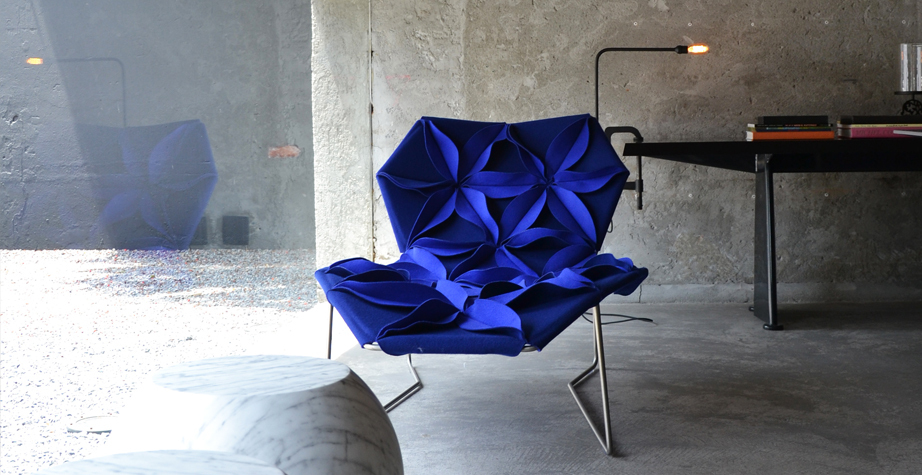 Antibodi 是 Patricia Urquiola 從一個花朵盛開的概念所創作的椅子,蜂窩式三角形花瓣串連縫製而成花朵散播在椅面上,片片花瓣的外型和多層次的材料,衍伸出豐富的圖案。