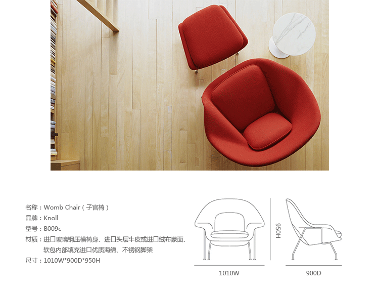 Womb Chair 的基本构造是由抛光镀铬或雾面钢管底座,以一体成型的泡棉包覆框架所组成。 Eero Saarinen 设计这张椅子挑战了一般世俗的规则,打破窠臼,树立了新的现代设计和舒适的标准,充分显示他的高超才华。