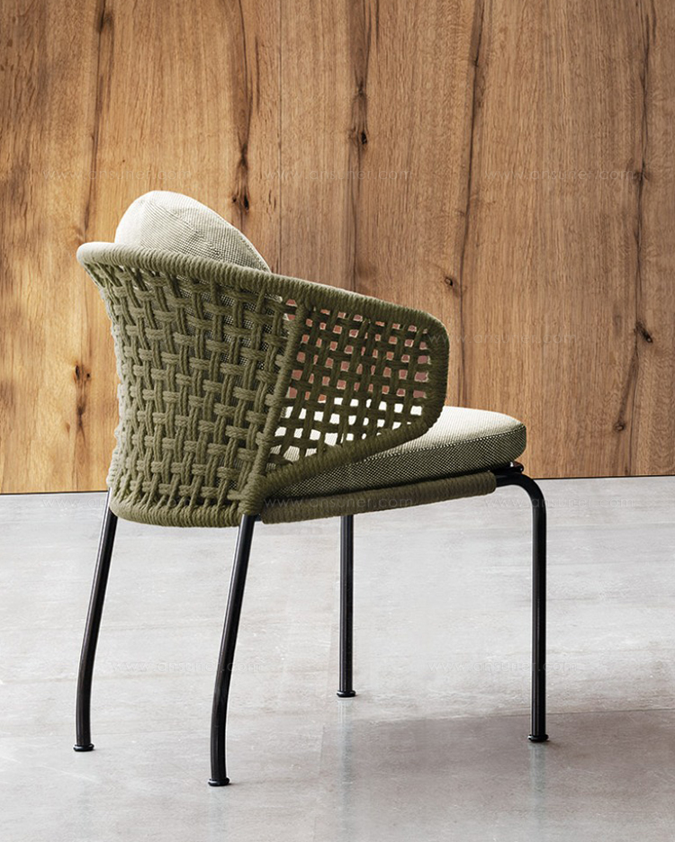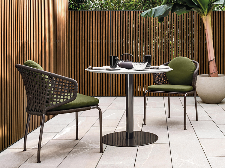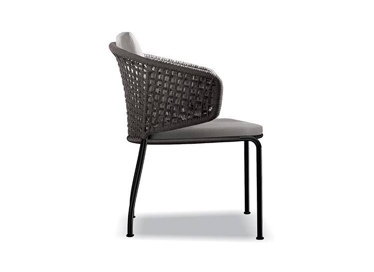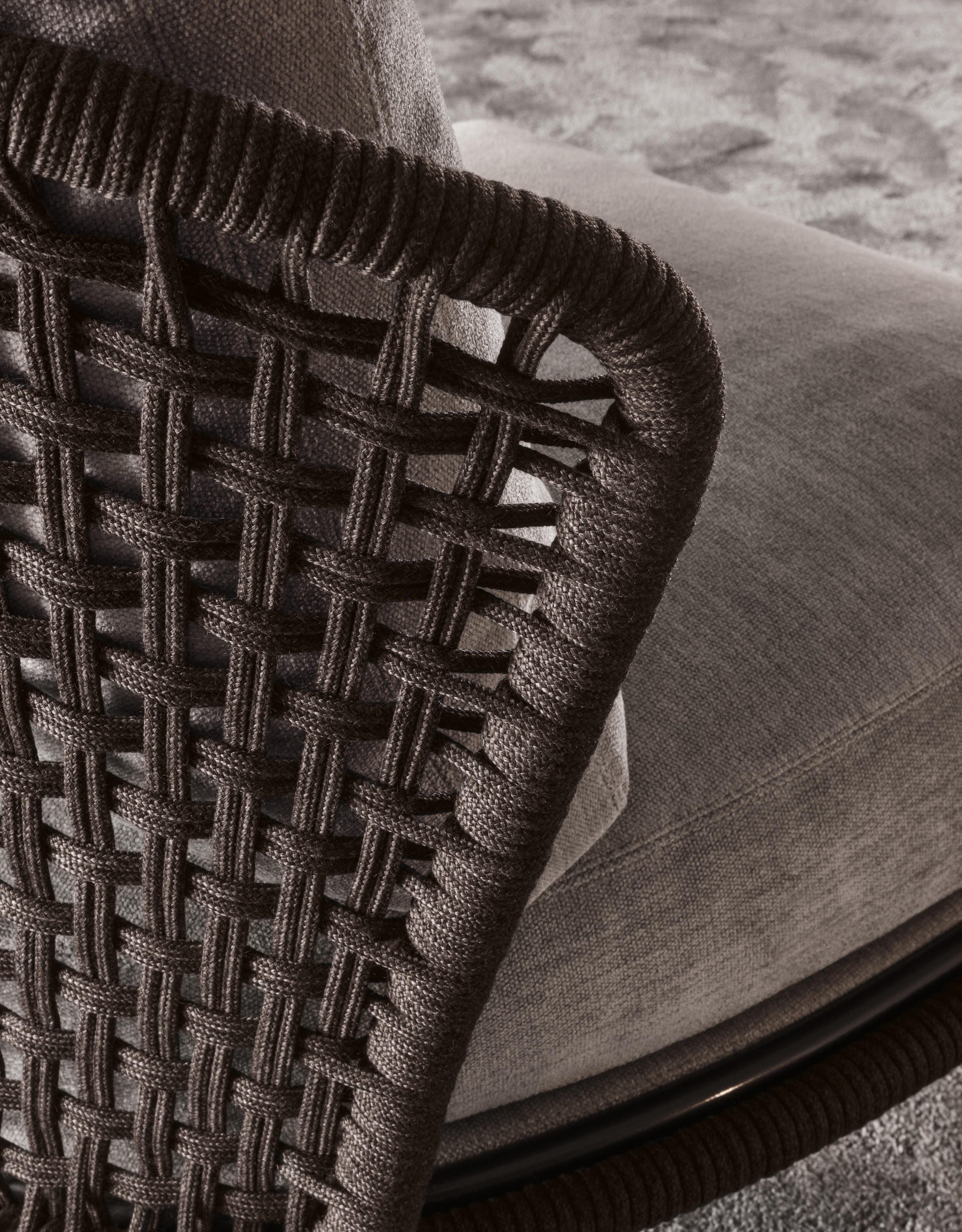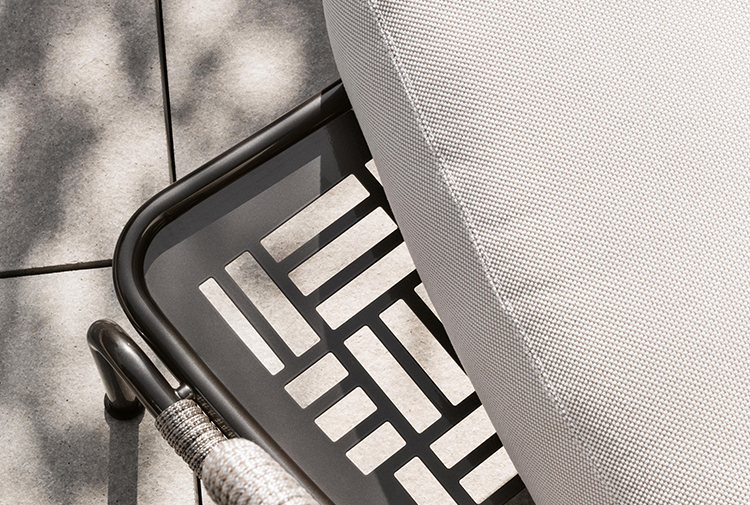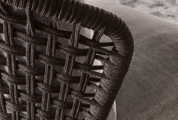 Aston是一个单品家族系列,其中包括沙发、沙发床、扶手椅、脚凳、座椅,为家居环境和“共享空间”提供优雅而时尚的装饰,在室内和室外皆可应对自如。阿斯顿“绳”户外系列采用金属材质的构架,搭配Pewter色聚酯漆面,部件都针对户外环境而经过特别处理,覆面采用疏水性纤维面料。靠背采用直径为7毫米的特殊聚丙烯纱线编织而成,两种颜色可供选择:浅灰色和深棕色,与全新Art Lifescape 02系列的面料和Alison “Dark Brown”户外系列的色调相得益彰。针对户外环境的特点,金属构架经过特别处理,搭配Pewter色聚酯漆面,覆面采用特殊聚丙烯纱线编织而成,有两种颜色可供选择:浅灰色和深棕色。坐垫采用Minotti Studio独家设计并通过激光加工而成的几何装饰。靠垫的内部填充物是高弹性聚氨酯泡沫,覆面采用疏水性纤维面料。