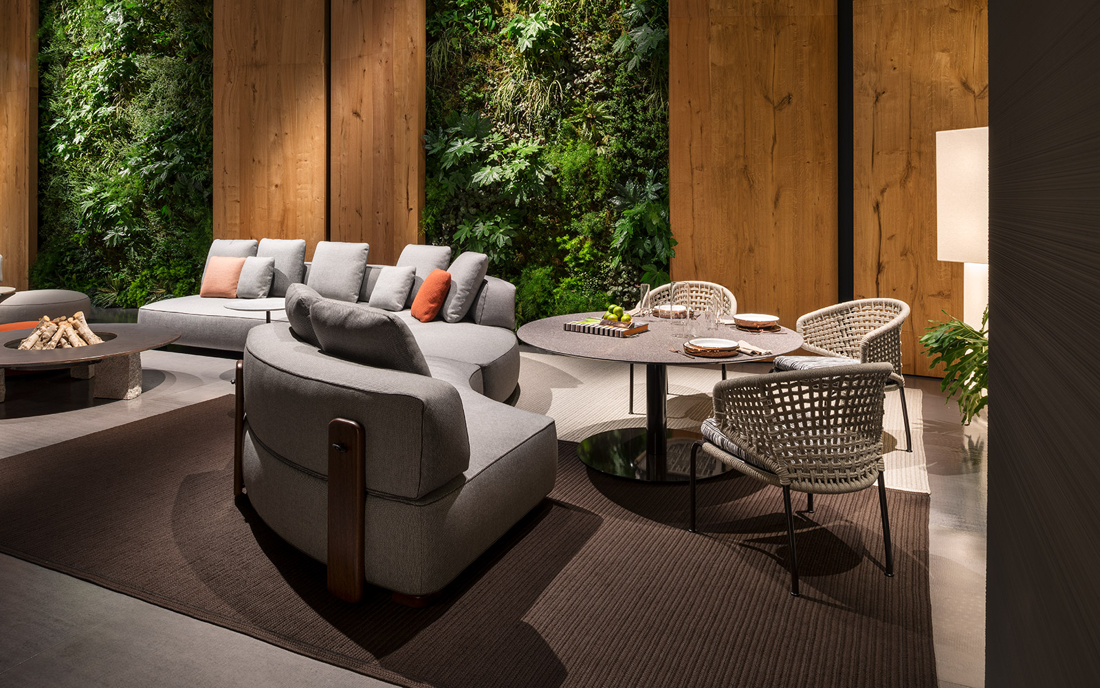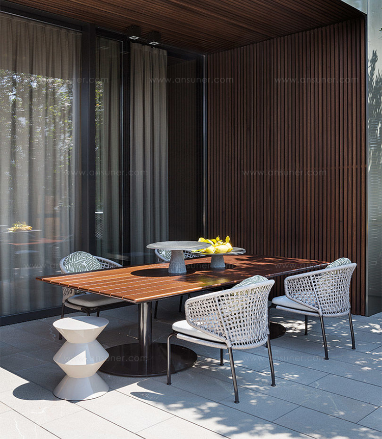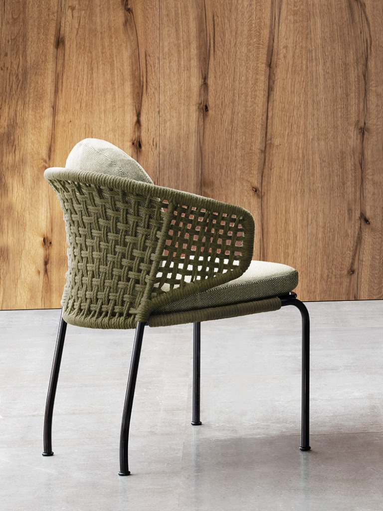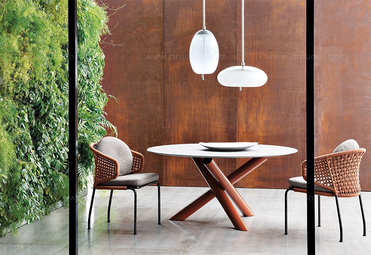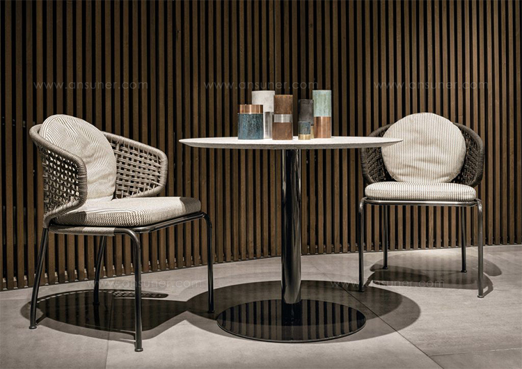 Aston是一个单品家族系列,其中包括沙发、沙发床、扶手椅、脚凳、座椅,为家居环境和“共享空间”提供优雅而时尚的装饰,在室内和室外皆可应对自如。阿斯顿“绳”户外系列采用金属材质的构架,搭配Pewter色聚酯漆面,部件都针对户外环境而经过特别处理,覆面采用疏水性纤维面料。靠背采用直径为7毫米的特殊聚丙烯纱线编织而成,两种颜色可供选择:浅灰色和深棕色,与全新Art Lifescape 02系列的面料和Alison “Dark Brown”户外系列的色调相得益彰。针对户外环境的特点,金属构架经过特别处理,搭配Pewter色聚酯漆面,覆面采用特殊聚丙烯纱线编织而成,有两种颜色可供选择:浅灰色和深棕色。坐垫采用Minotti Studio独家设计并通过激光加工而成的几何装饰。靠垫的内部填充物是高弹性聚氨酯泡沫,覆面采用疏水性纤维面料。