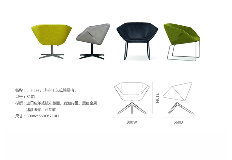 Ella Easy Chair(艾拉简易椅)由著名设计师Niels Bendtsen设计的。这把椅子是一个紧凑的座位让你采取的所有礼仪坐姿轻松而获得适当支持.一个显著的特点是它的扣盘形状,连同它的几何面两侧扶手椅给一个真正独特的外观.阀座完全由聚氨酯泡沫成型,具有特别高的耐久性.此款为三趾脚架,采用进口皮革或绒布蒙面、发泡内胆、可自由旋转。