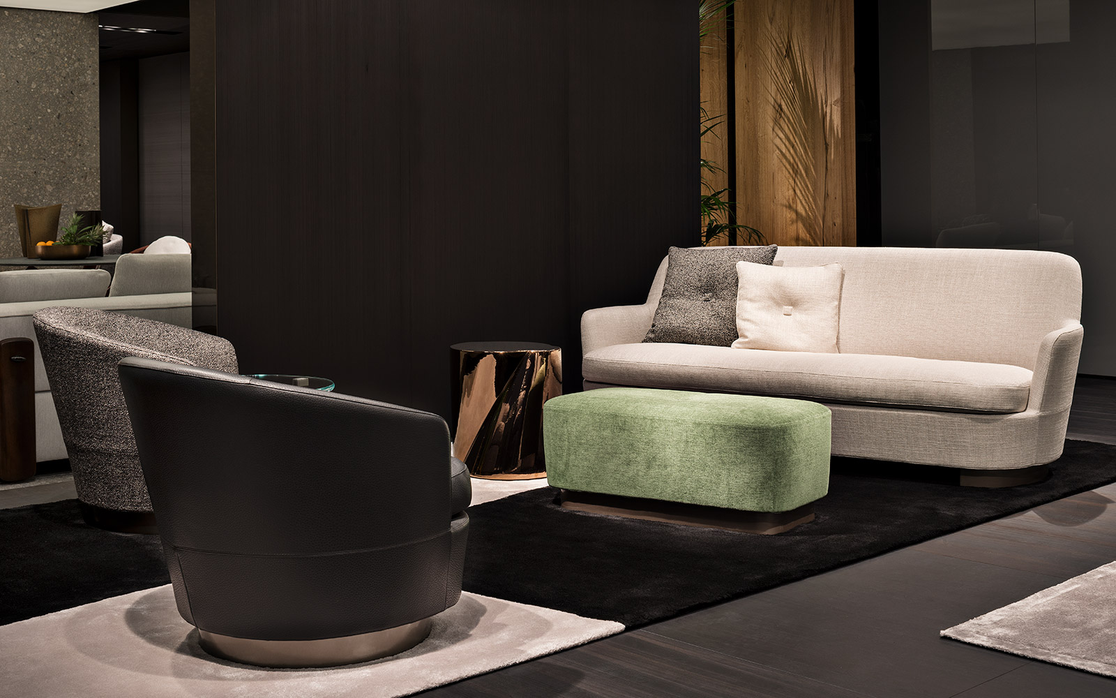 柔和的造型、紧凑的比例和具有视觉冲击力的细节呈现出精致的美学语言,金属基座采用淡铜色的表面设计。