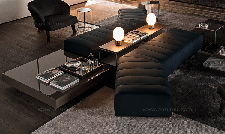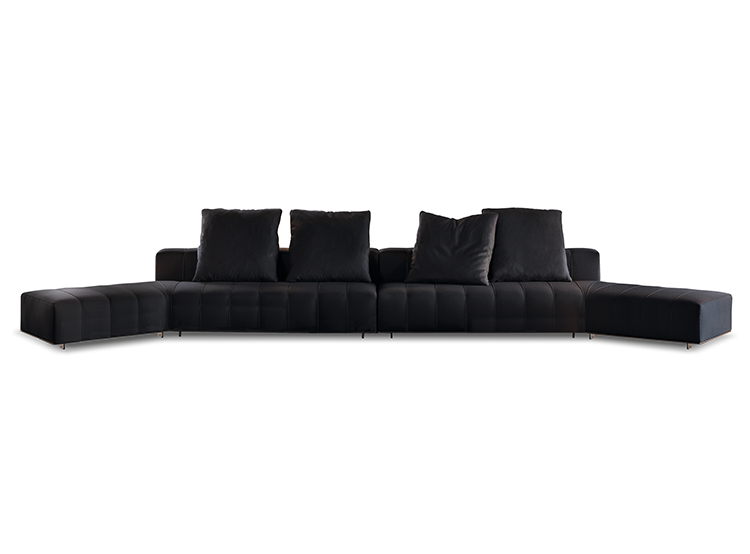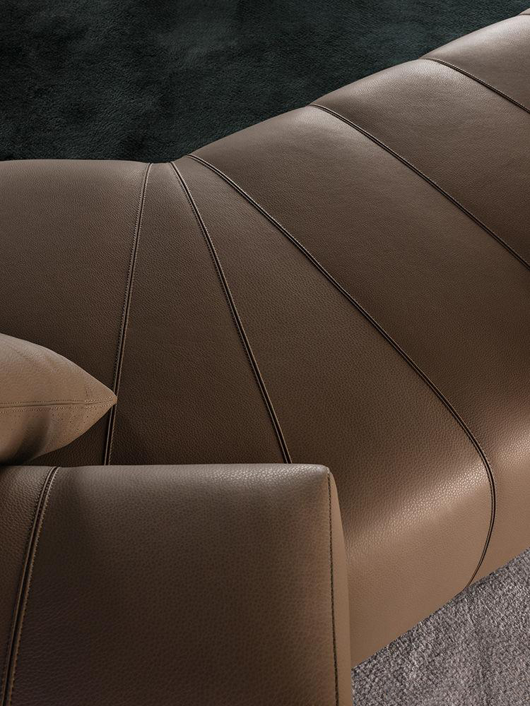 弗里曼“裁缝”项目的理念和原创性在其衍生系列弗里曼“休息室”中也有所体现。弗里曼“休息室”沙发纵深度有所降低,不仅更易搭配较小的居住空间,还可以用在接待场所,如等候室、前台区域、行政办公室。单组沙发的特点在于采用规则图形纹样的优雅缝线设计,可以自由随性地组合沙发,打造灵动的造型。“Wing”扶手拥有轻盈的线条,这要得益于采用聚氨酯为基材的泡沫金属框架。精致的包覆材料展现出公司运用复杂面料进行剪裁加工的实力。皮革和织物面料的各个部件通过浅铜色人造皮革束带和双缝线工艺连接在一起,打造出独特的纵深效果。