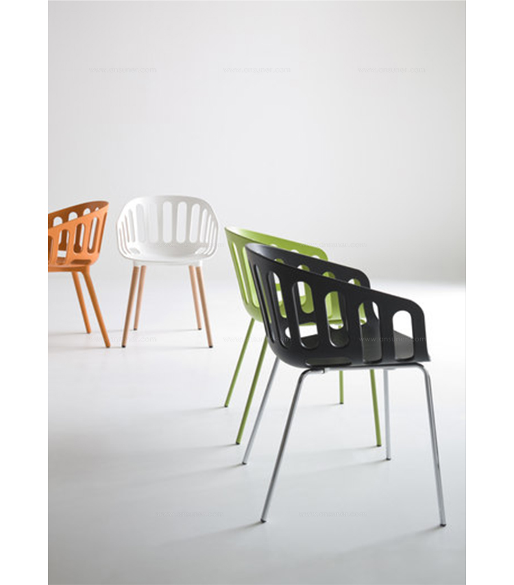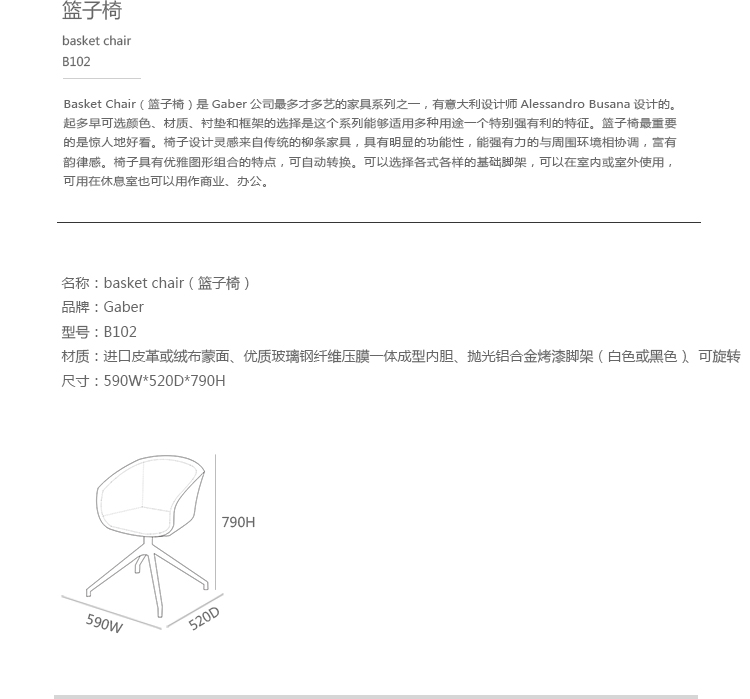 Basket Chair(篮子椅)是Gaber公司最多才多艺的家具系列之一,由意大利设计大师Alessandro Busana设计的。其多种可选颜色、材质、衬垫和框架的选择,是这个系列能够适用多种用途一个特别强有力的特征。篮子椅最重要的是惊人地好看。椅子设计灵感来自传统的柳条家具,具有明显的功能性,能强有力的与周围环境相协调,富有韵律感。椅子具有优雅图形组合的特点,可自由转换。可以选择各式各样的基础脚架,椅子很容易可叠起堆放的,可以在室内或室外使用,可用在休息室也可以用作商业、办公。经典的4腿的金属脚架,可选择6种不同颜色,设置有特殊软垫和防滑可移动垫,塑料和织物塑造了一个有独创性的对比。