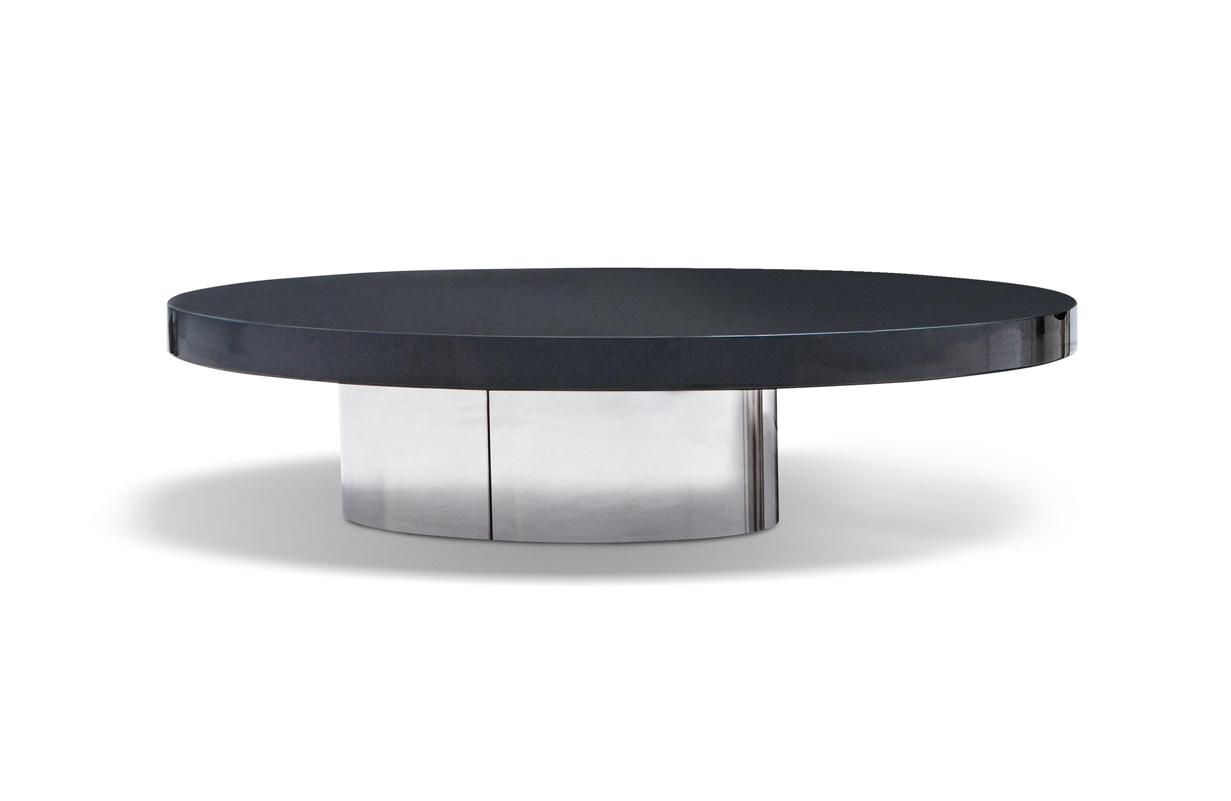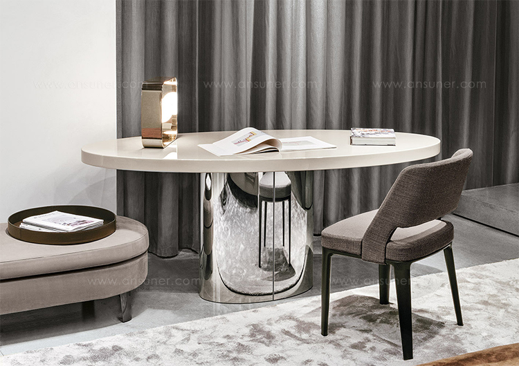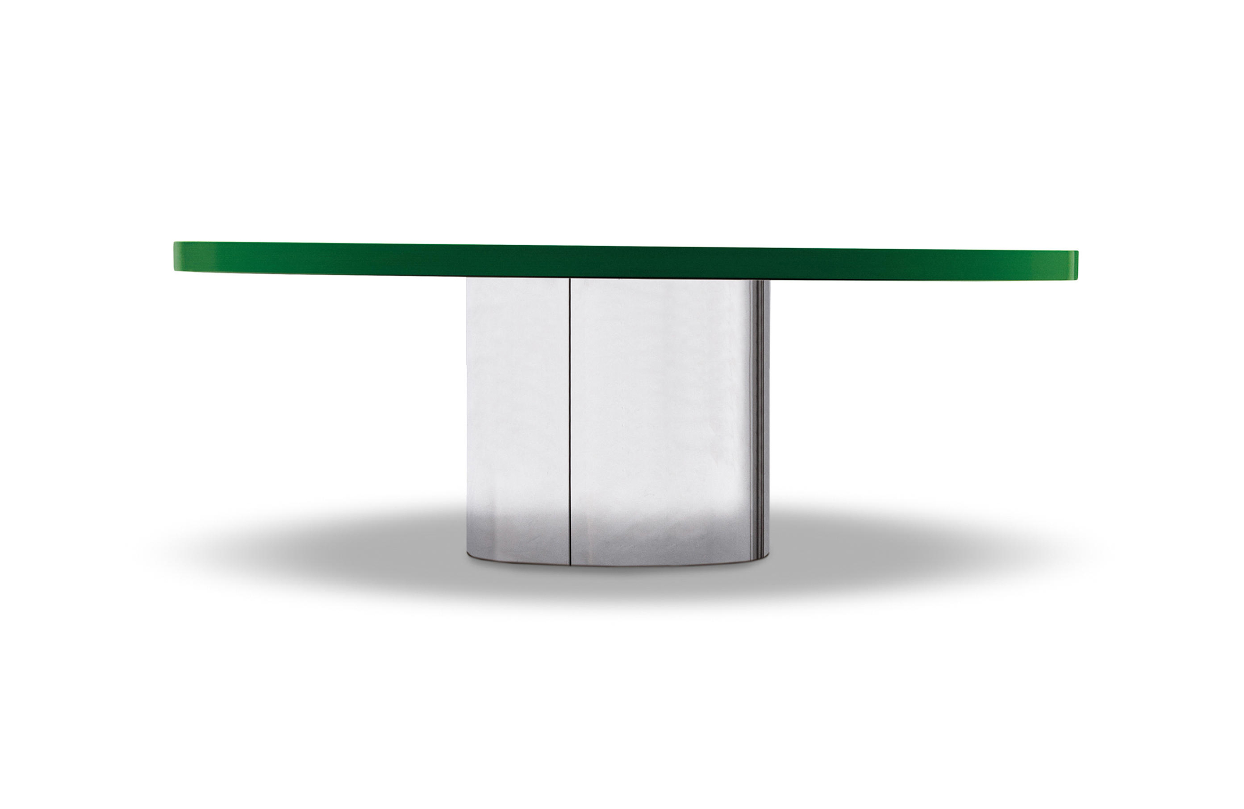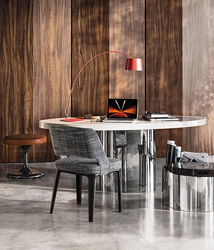 体积与造型的游戏,大胆的不对称性,一切似乎是对地心引力的挑战。这就是Raymond的美学理念。这款产品有两种高度可供选择,61厘米和74厘米。椭圆的造型是基座和台面的主题元素,基座采用镀铬金属制成,台面的亮光漆色彩缤纷:白色,Sand色,紫色,绿色和花岗石色。