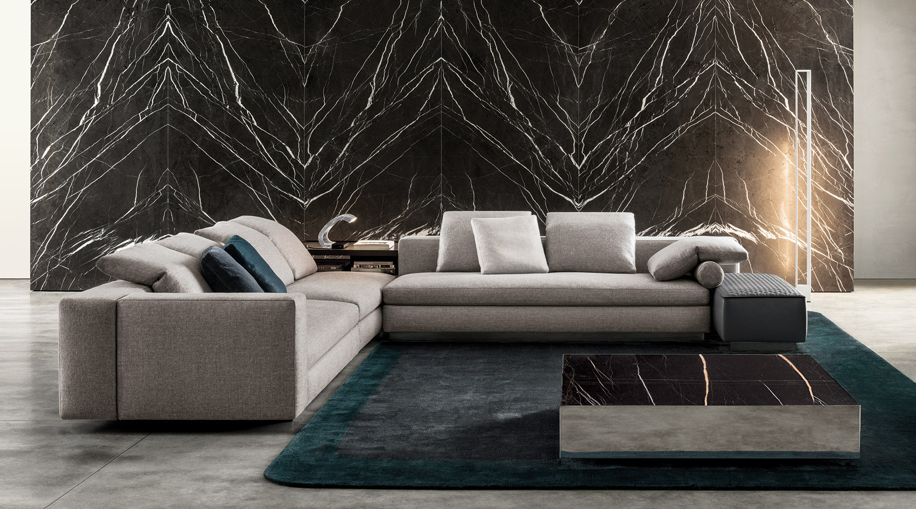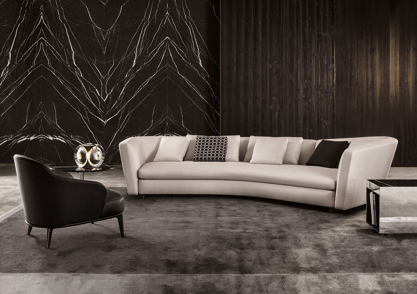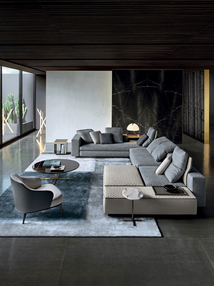 这是用于收纳贵重物品的边几系列,拥有纯粹而简洁的美学设计,有着精美绝伦的多种材质组合。这一边几家族拥有华贵的美学特质,因而也有着非同一般的功能,在提供实用置物表面的同时,呈现精美的装饰效果,具有50年代和60年代的米兰设计风格。金属构架的表面有亮铬色、亮金色和亚光铜色,嵌入构架的台面可谓画龙点睛,选用多种珍稀的大理石材质,其中包括Arabescato Purple、Sahara Noir和Rosso Levanto,或是Moka色的白蜡木、Moka色橡木。从建设性的角度来看,Elliott边几的内部储物空间可以用于摆放杂志或其他物件,有花岗石色的亮面漆或Moka色开孔橡木可供选择。金属材质的外部框架搭配包覆木质的内部框架,以此可以看出工艺的复杂性,同时平添一份温暖的质感,展现Elliott边几的名贵特质。