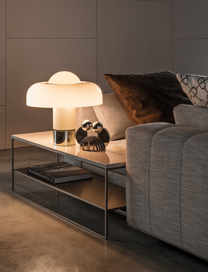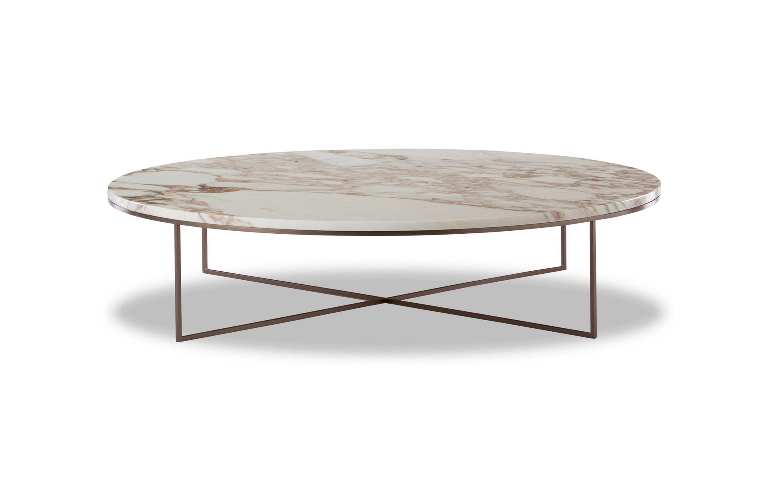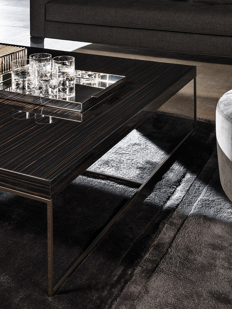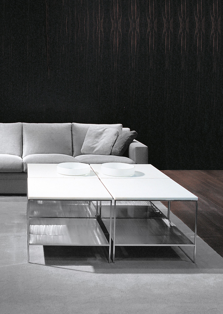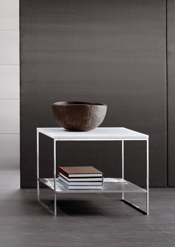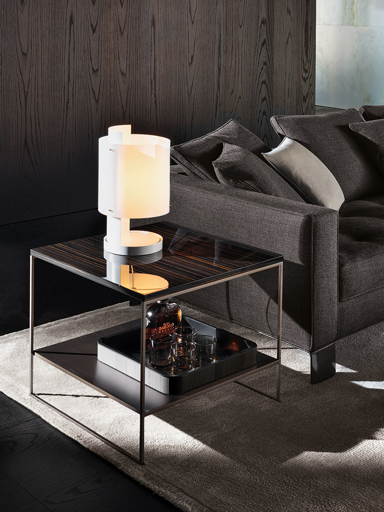 Calder家族有各种尺寸的边几和边桌,这一组全新的设计方案为其带来更为清新时尚的造型。铁架结构如今采用亚光浅铜色的表面。桌面也推出新版本:Sand色亮漆,米灰色的鲍迪豆木饰贴面,Bardiglio Nuvolato和Calacatta的大理石。中间层的桌面也为亚光浅铜漆面的金属。