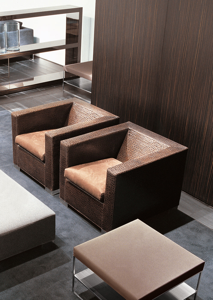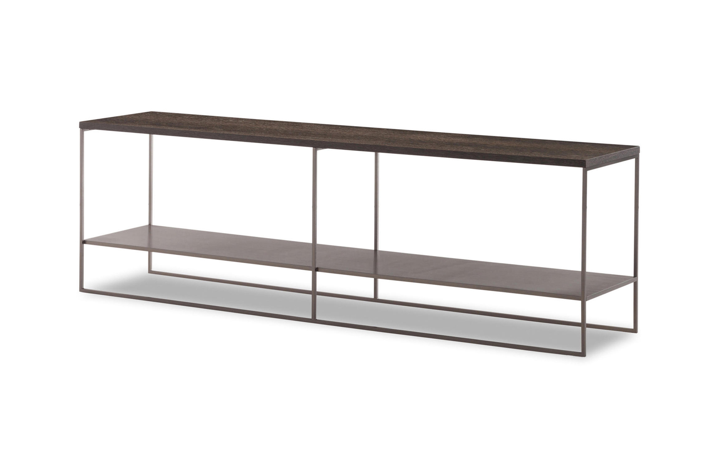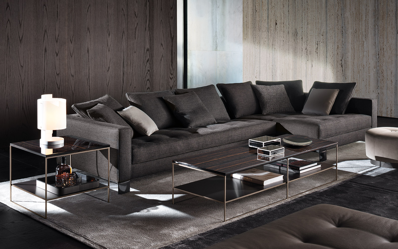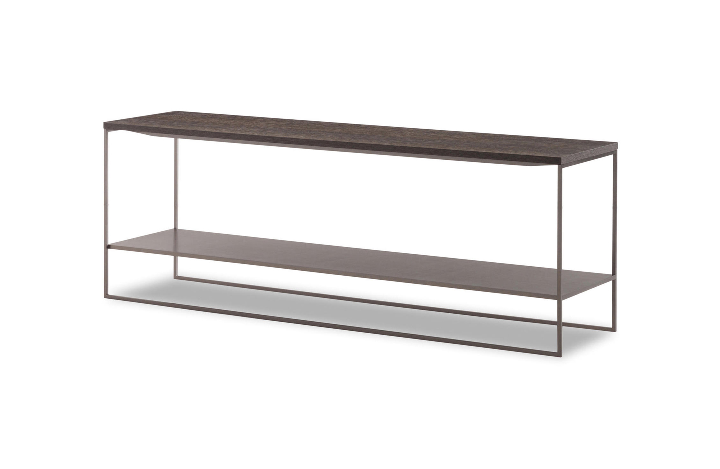 Calder家族有各种尺寸的边几和边桌,这一组全新的设计方案为其带来更为清新时尚的造型。铁架结构如今采用亚光浅铜色的表面。桌面也推出新版本:Sand色亮漆,米灰色的鲍迪豆木饰贴面,Bardiglio Nuvolato和Calacatta的大理石。中间层的桌面也为亚光浅铜漆面的金属。