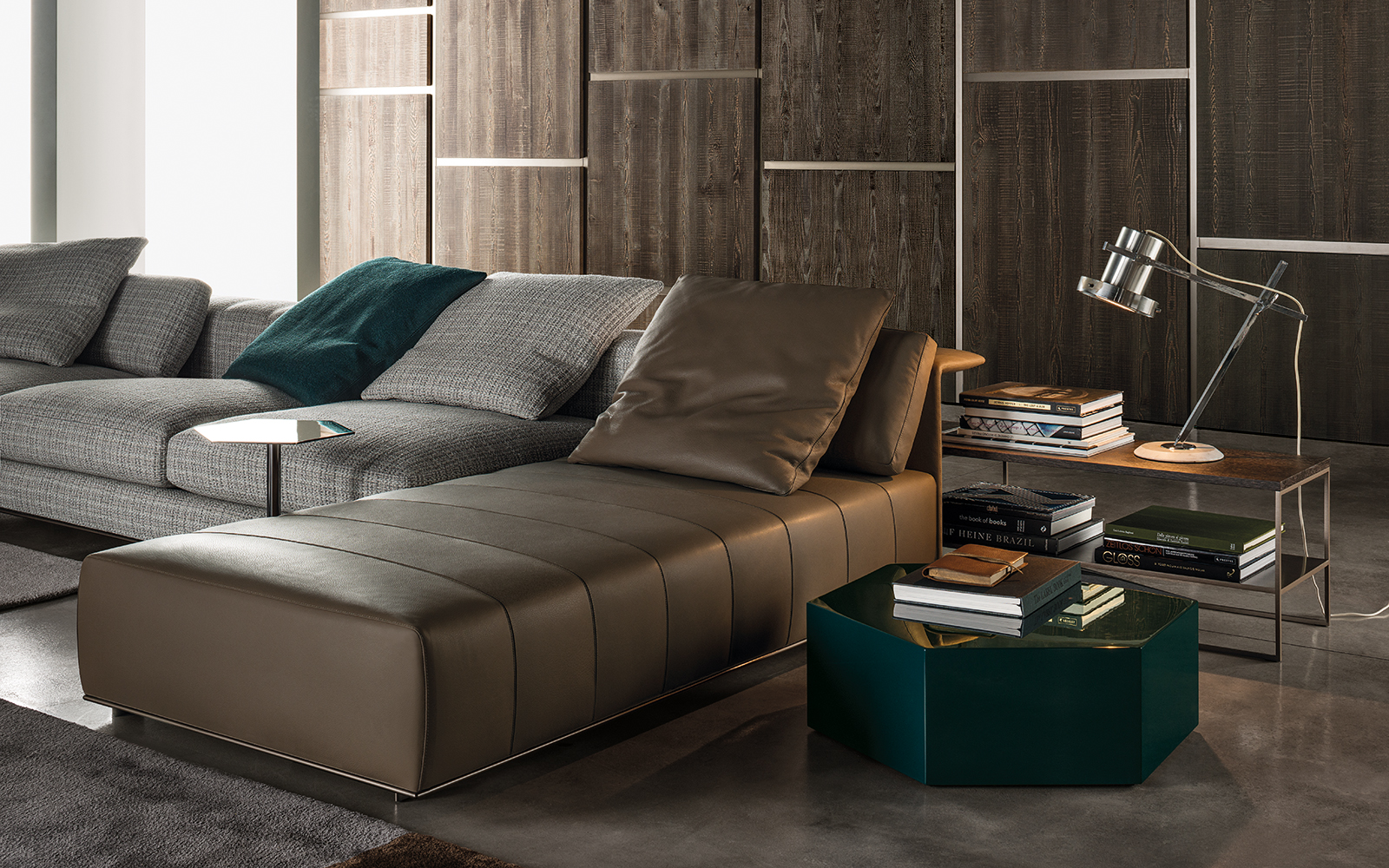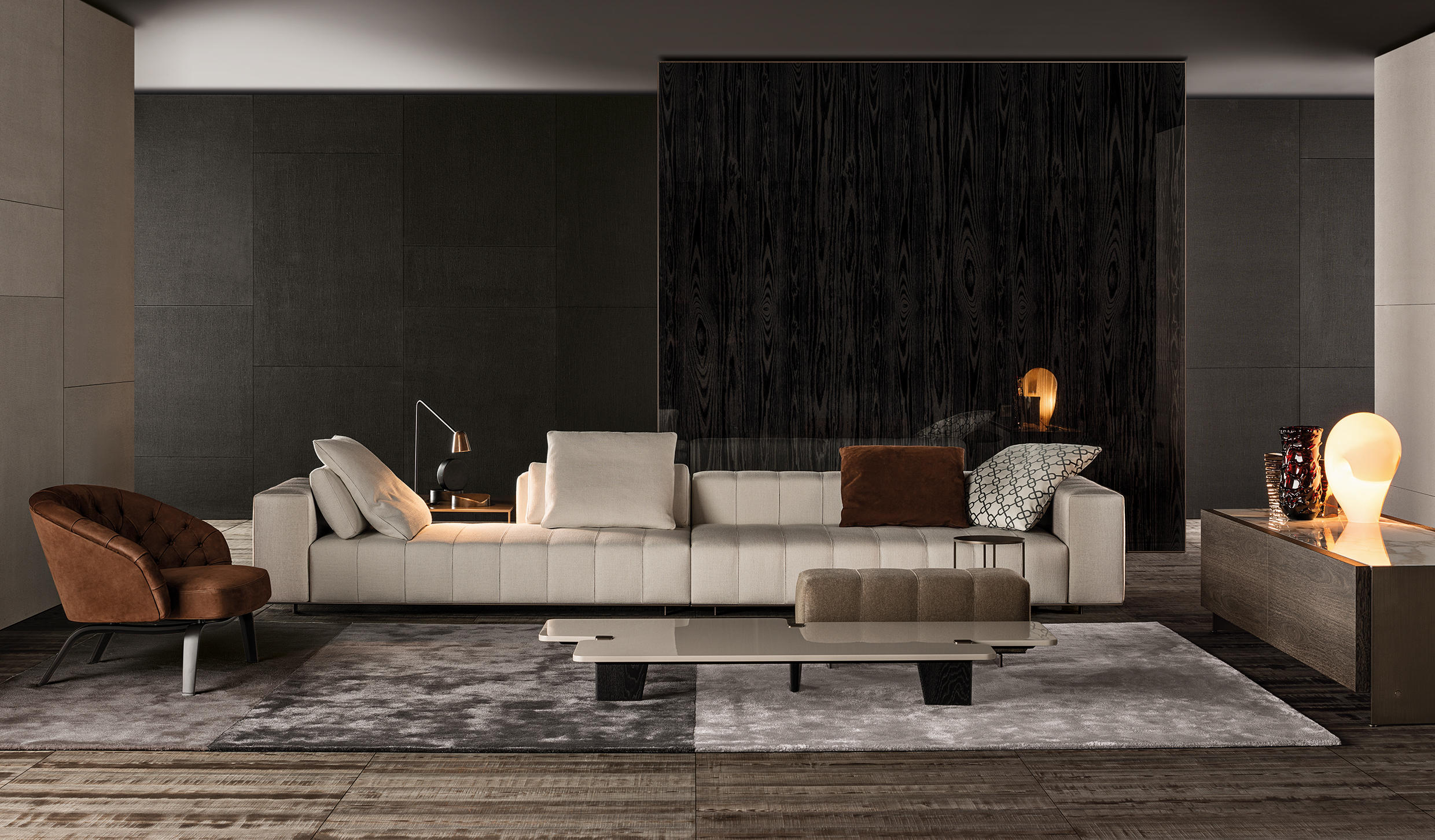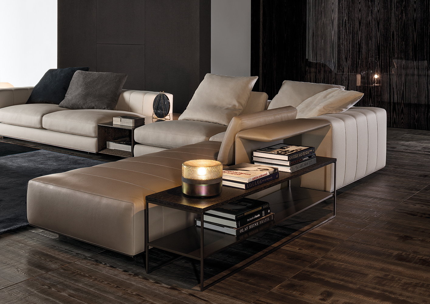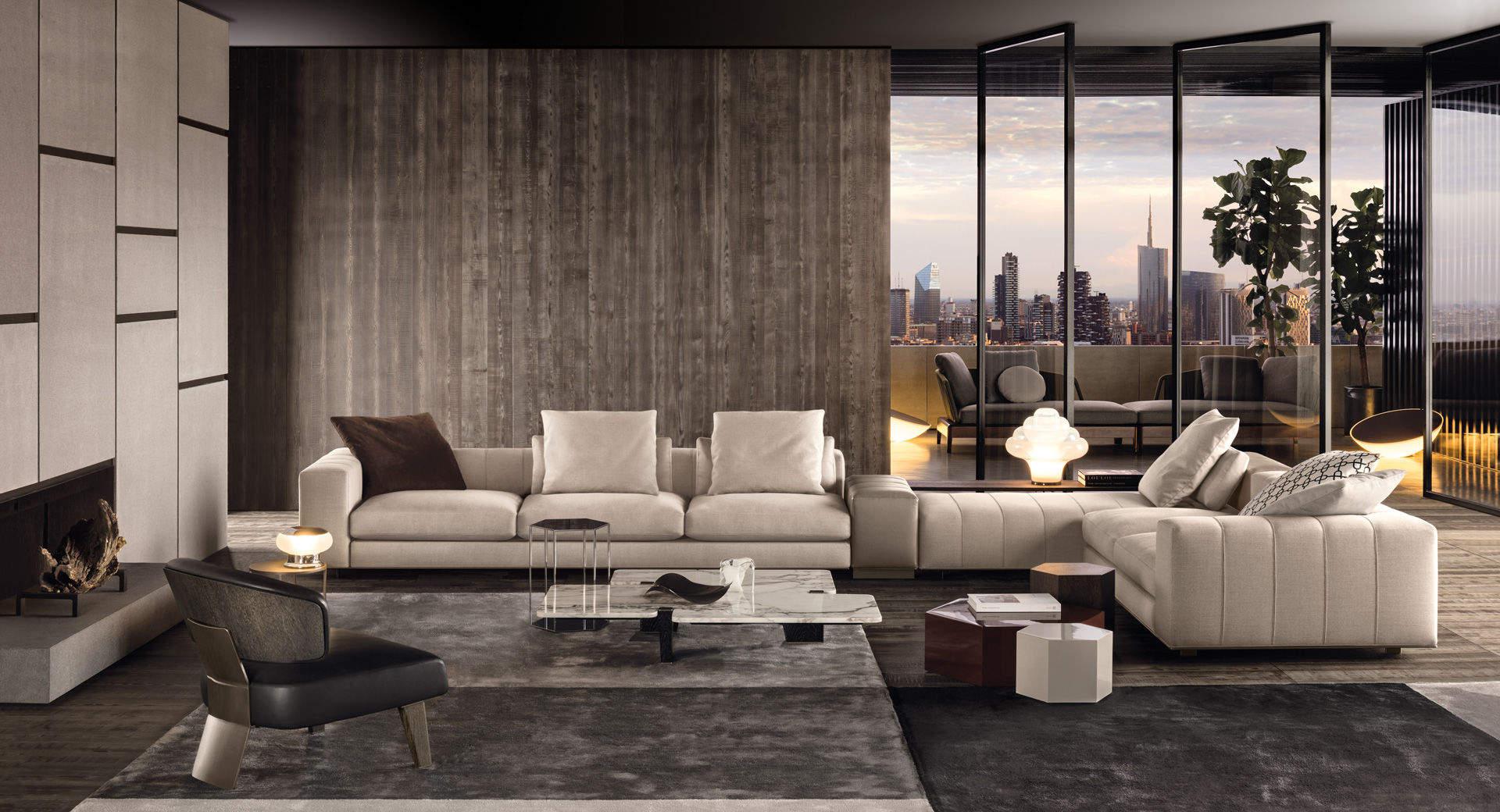 Calder家族有各种尺寸的边几和边桌,这一组全新的设计方案为其带来更为清新时尚的造型。铁架结构如今采用亚光浅铜色的表面。桌面也推出新版本:Sand色亮漆,米灰色的鲍迪豆木饰贴面,Bardiglio Nuvolato和Calacatta的大理石。中间层的桌面也为亚光浅铜漆面的金属。