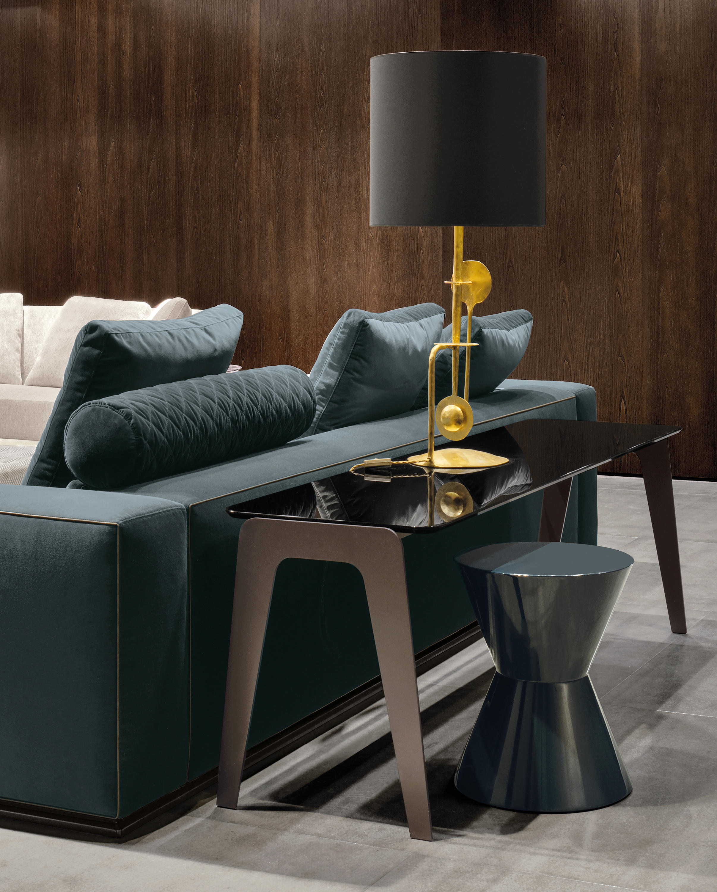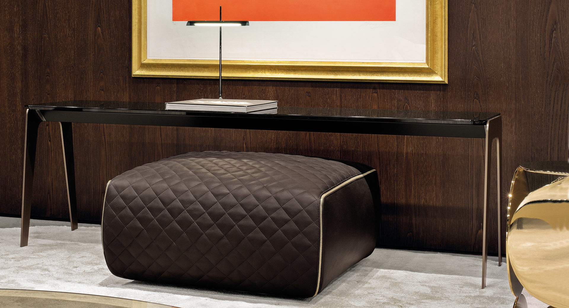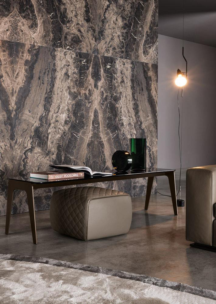 以精美梣木底座致敬传统黑檀木艺术,搭配拥有圆滑转角与柔和饰边的光泽漆面黑檀木、黑色脱蜡琉璃及 Marron Damasco 大理石台板。