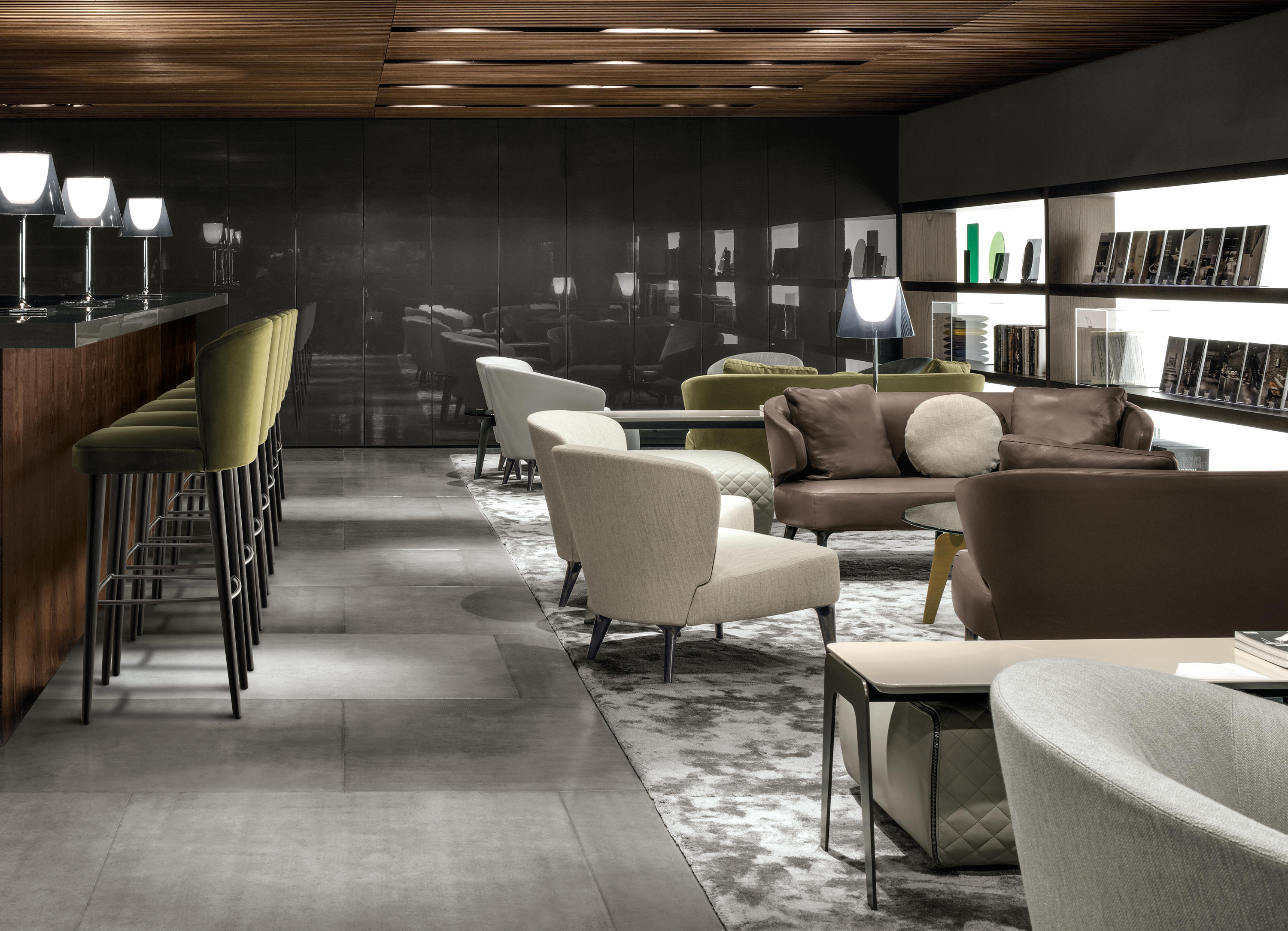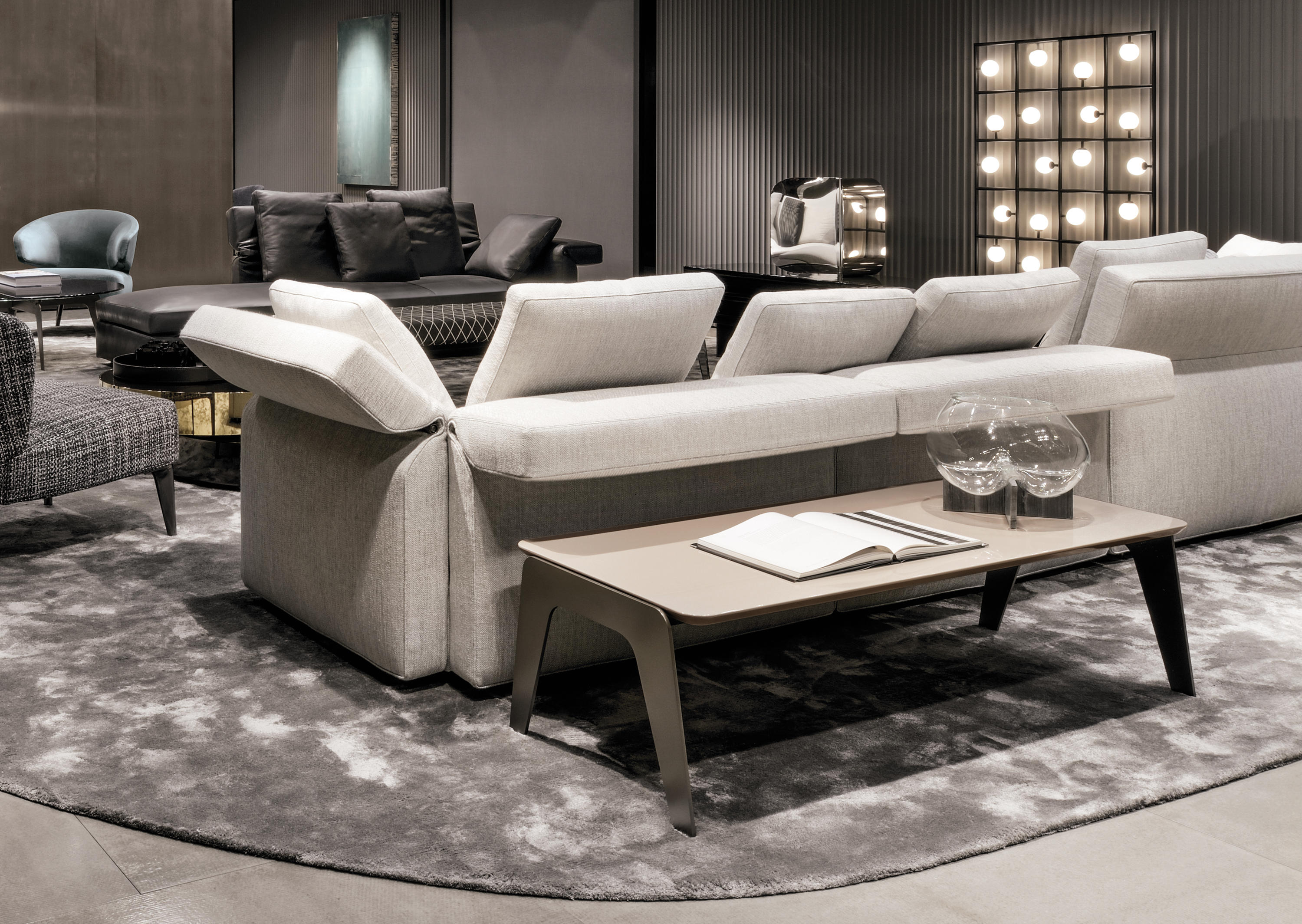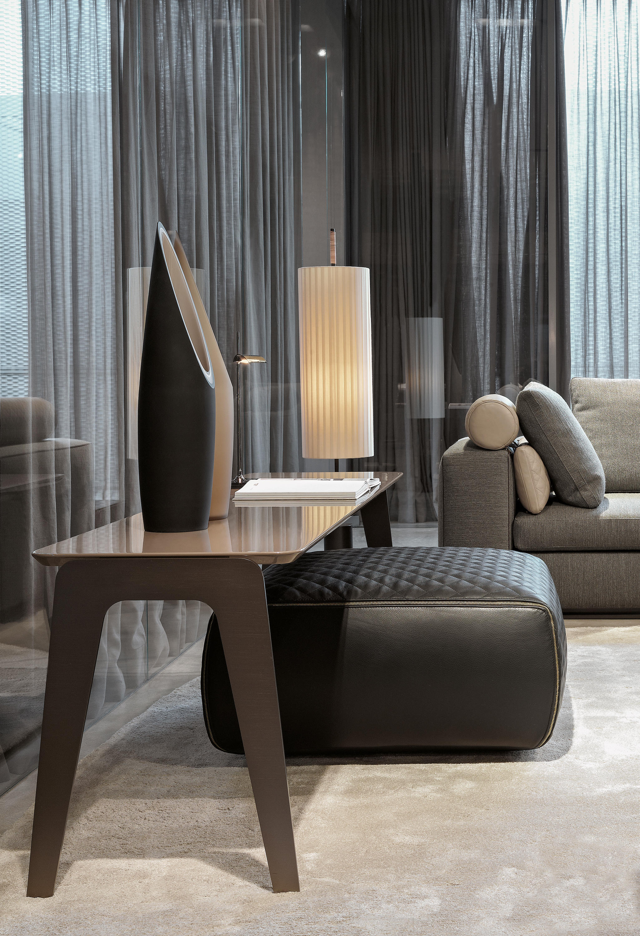 以精美梣木底座致敬传统黑檀木艺术,搭配拥有圆滑转角与柔和饰边的光泽漆面黑檀木、黑色脱蜡琉璃及 Marron Damasco 大理石台板。
