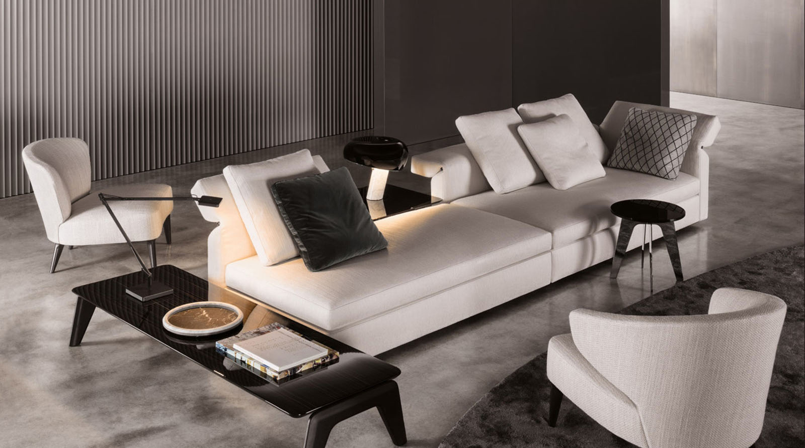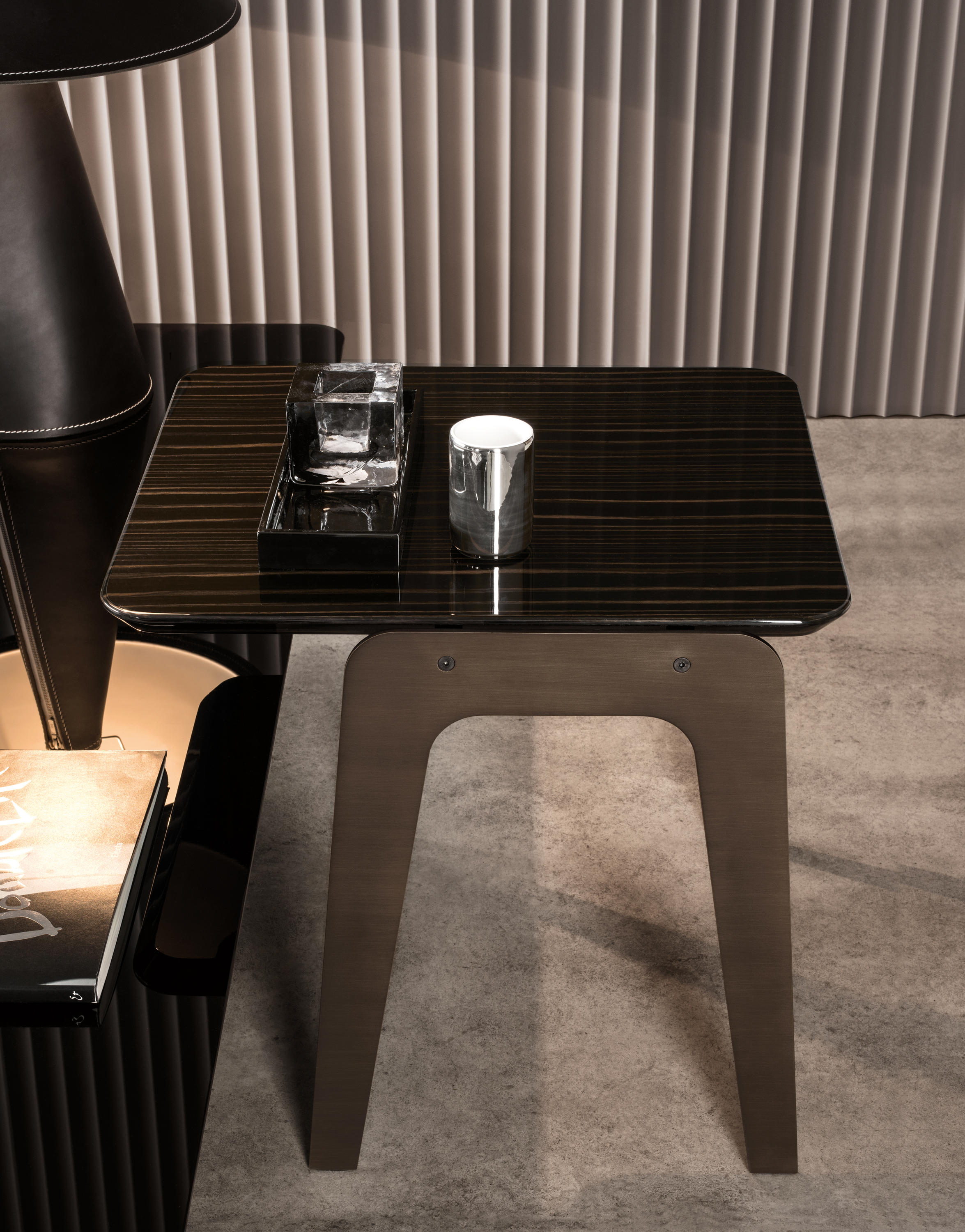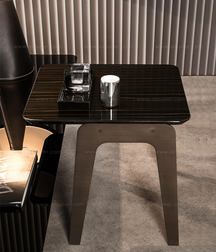 以精美梣木底座致敬传统黑檀木艺术,搭配拥有圆滑转角与柔和饰边的光泽漆面黑檀木、黑色脱蜡琉璃及 Marron Damasco 大理石台板。