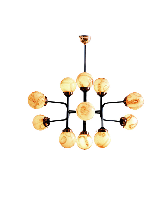 Ziron是一款完全手工制作的枝形吊灯,灵感来自古董手工制作的眼镜,不再生产。 每个手工吹制的玻璃穹顶都是独特的,具有不同的图案,但是以优雅的方式相互协调。 黑色涂漆的金属片弯曲并连接在一起,从而形成枝形吊灯的臂。 结合抛光铜,Ziron是一款现代吊灯,给人一种怀旧的感觉。