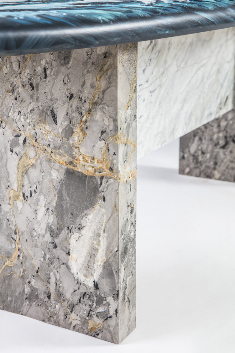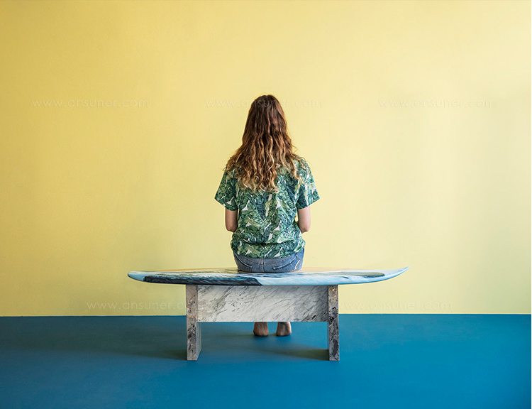 这条长凳的设计理念是:即使固定在固定的地方,也要不断移动。它结合了手工制作的石灰木和对比鲜明的大理石腿。座位是手绘的,让人想起神奈川的巨浪。