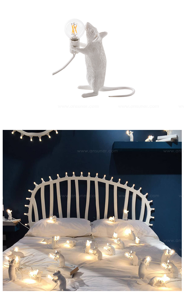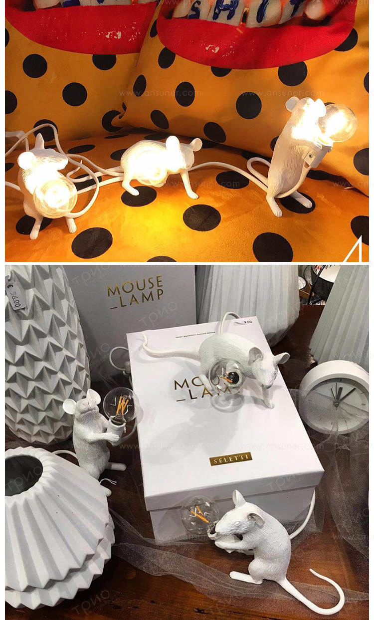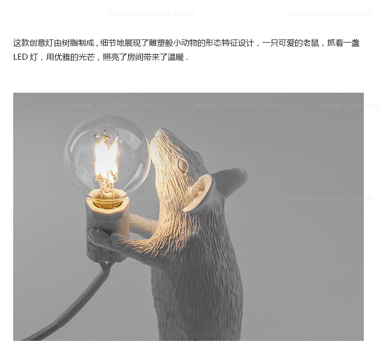 由Marcantonio Raimondi Malerba为Seletti设计的鼠标灯座为设计师的动物灯系列增加了一个新的品种。就像猴子灯,它美丽地再现了动物在树脂中的特点,这些鼠标灯显示出同样的注重细节和雕塑设计。同时以温暖的光芒照亮他们。这款设计灯是为室内使用而创建的,它可以单独使用,也可以与来自同一系列的其他两个版本配对使用。由树脂制成,有一层白色的光泽。