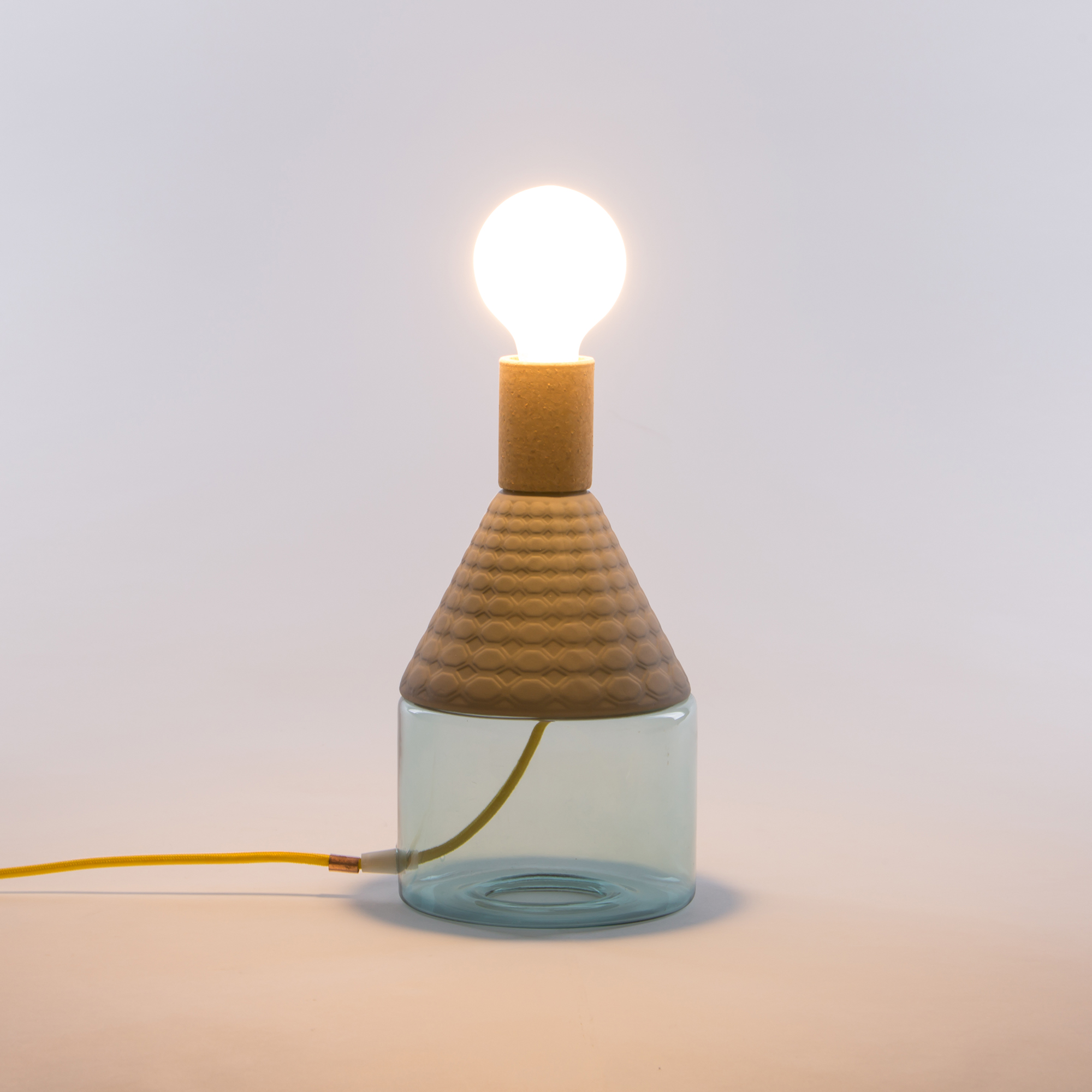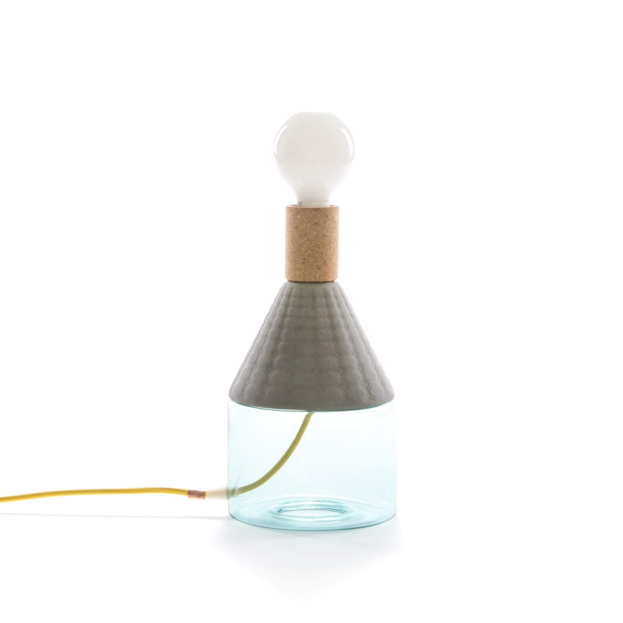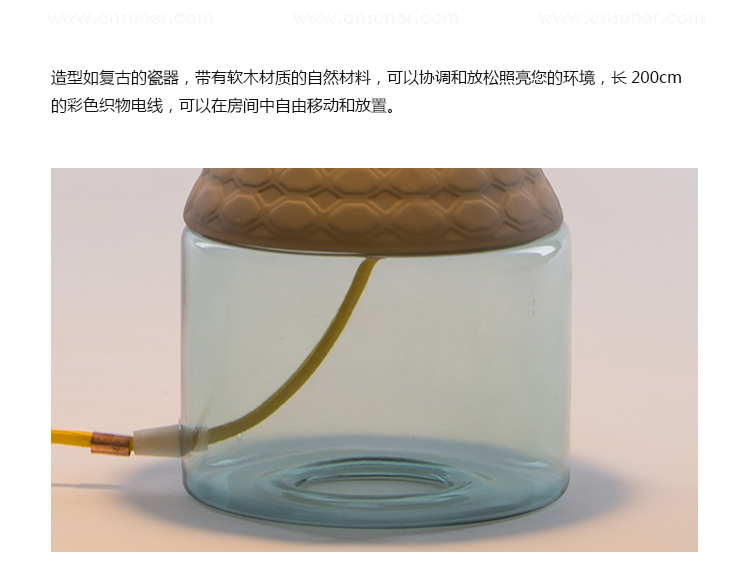 造型如复古的瓷器,带有软木材质的自然材料,可以协调和放松照亮您的环境,长200cm的彩色织物电线,可以在房间中自由移动和放置。