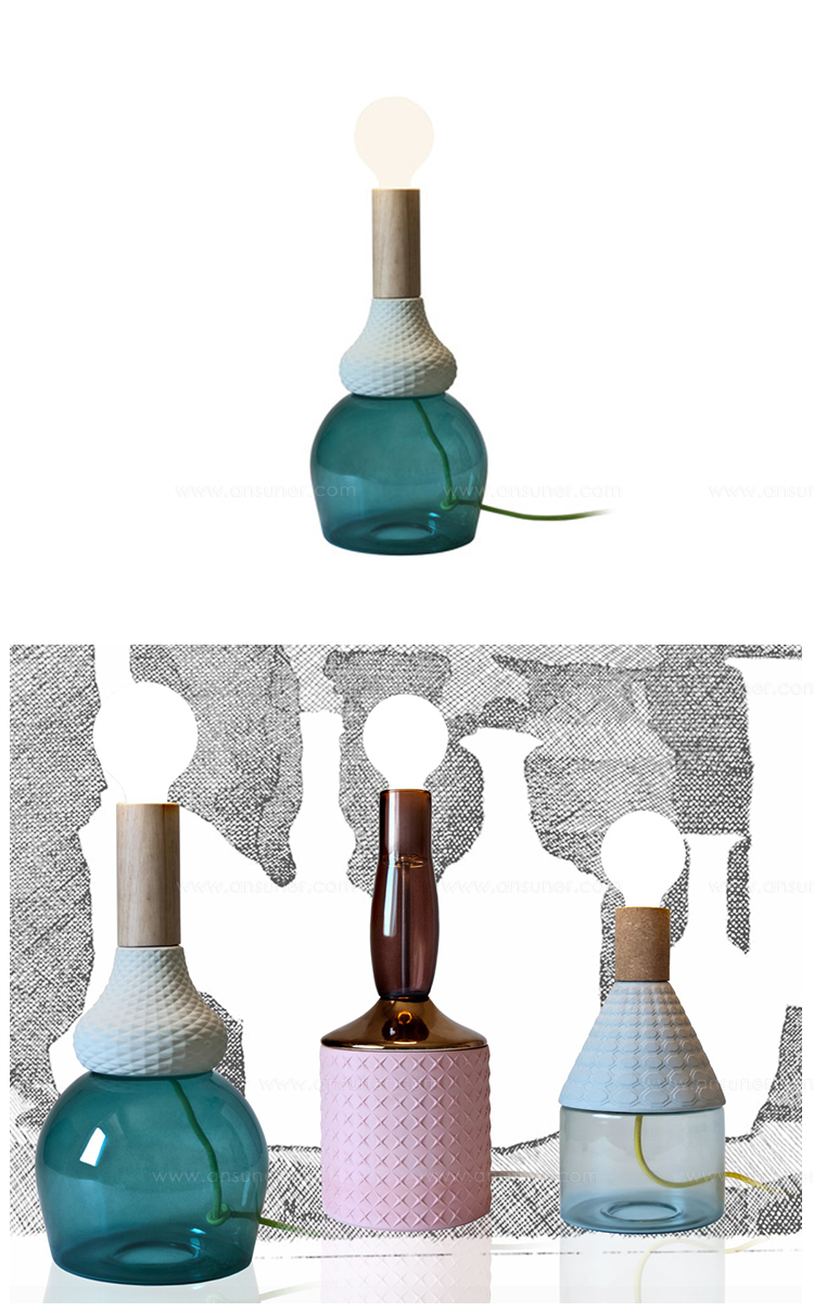 造型如复古的瓷器,带有软木材质的自然材料,可以协调和放松照亮您的环境,长200cm的彩色织物电线,可以在房间中自由移动和放置。