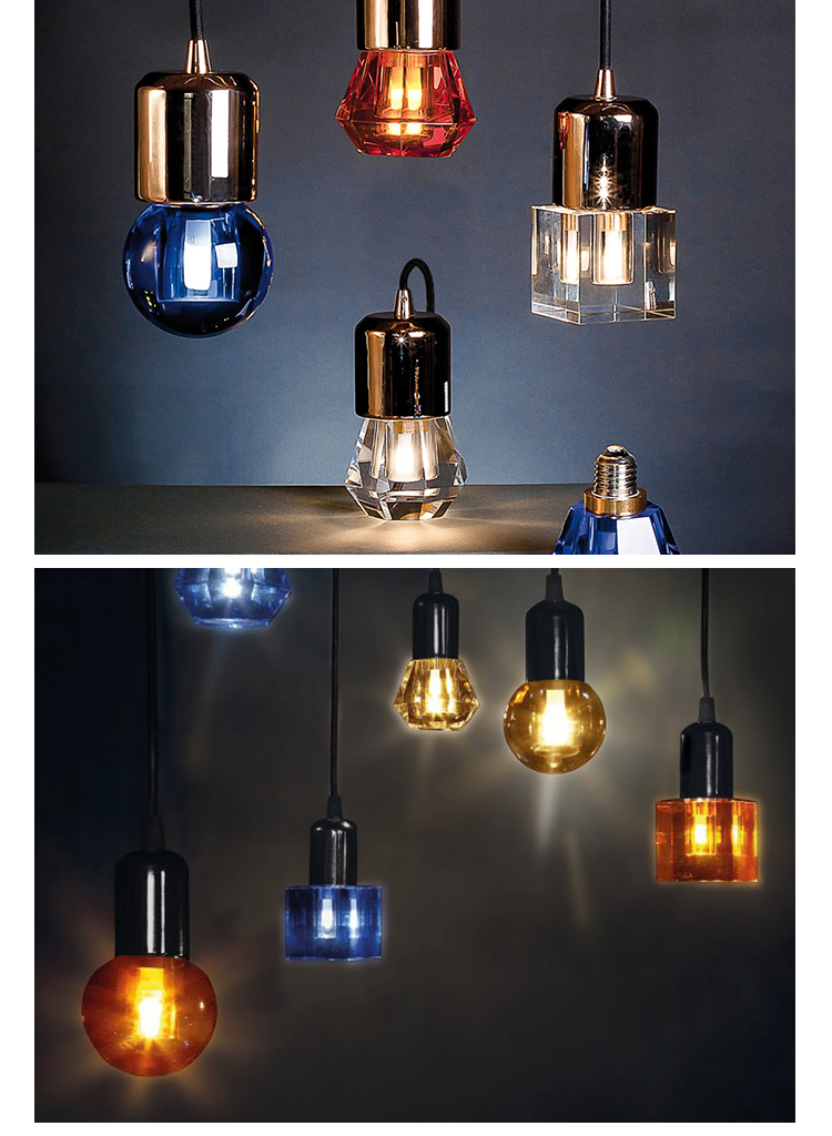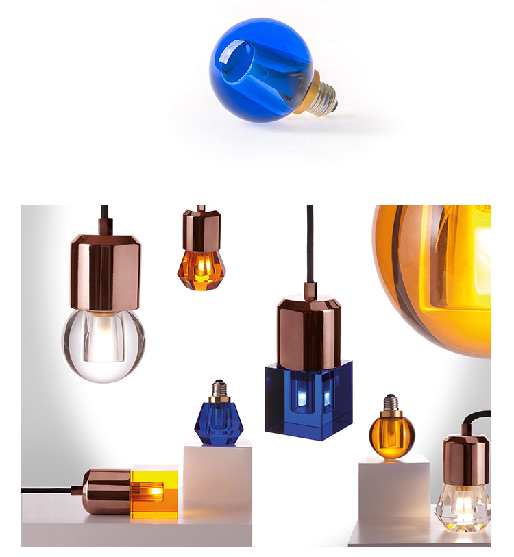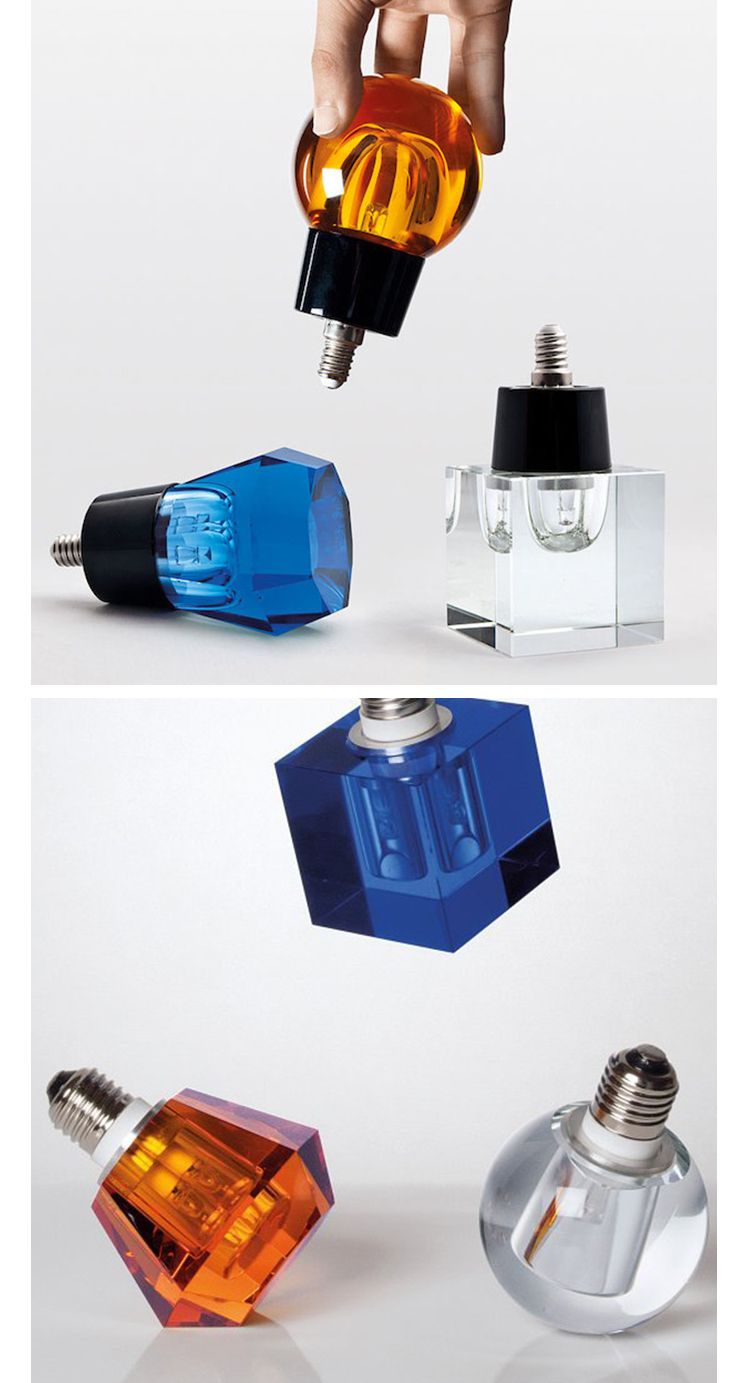 一个新的灯泡概念,在水晶,技术和复杂的透明度之间的对话,经过刻面手工处理.灯泡被重新解读为闪闪发光的宝石,三款灯泡由三种不同水晶形状和三种颜色组成.