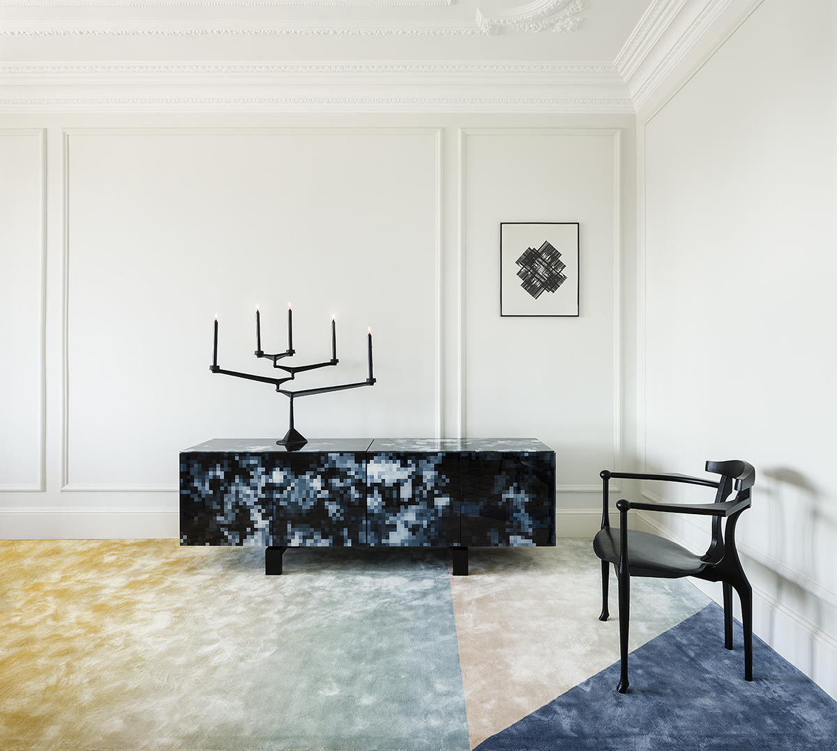 梦想内阁以三种颜色呈现:颜色,黑色和白色。很少有人会允许具有这种个性的干预措施而不会影响其创建功能。它们被转换成用于房屋或酒店门厅中客厅的雕塑。 模块,门,正面部件和抽屉均涂有磨砂黑色表面漆。顶部,正面和侧面均装有6毫米钢化印刷玻璃。桌腿:实心榉木漆成哑光黑色