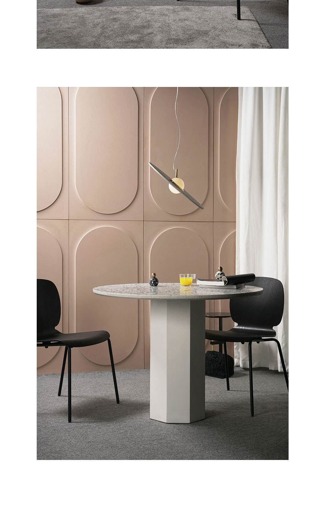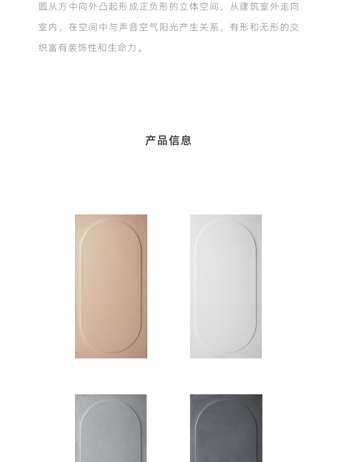 O从方与圆直线与曲线平面与弧面之间构建一种对偶关系,从罗马斗兽场建筑中得到启发,用当代的设计语言形式进行诠释,一个圆象征着一个空间一种视角展开想象,从不同视角中看到自我的认知和理解; 圆从方中向外凸起形成正负形的立体空间,从建筑室外走向室内,在空间中与声音空气阳光产生关系,有形和无形的交织富有装饰性和想象力;