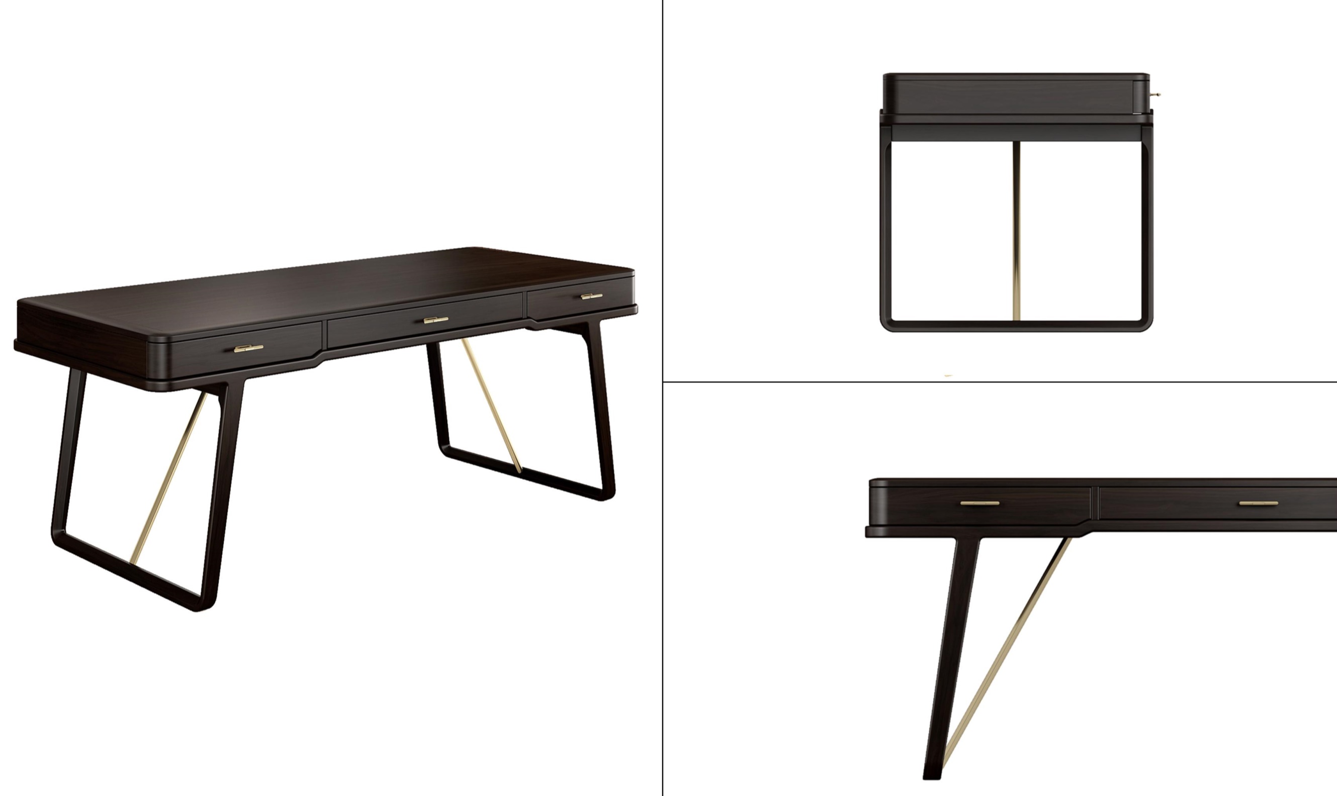 1.书桌整体简洁干练,以线为主,秀美颀长。 2.腿部内收,上收下分,具有很好的视觉稳定感稳重大方。 3.铜条拉杆与铜把手的装饰,在保证实用性的同时赋予独特中式韵味,彰显价值。