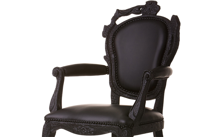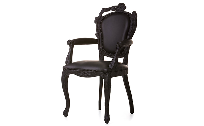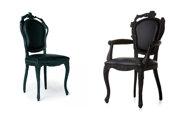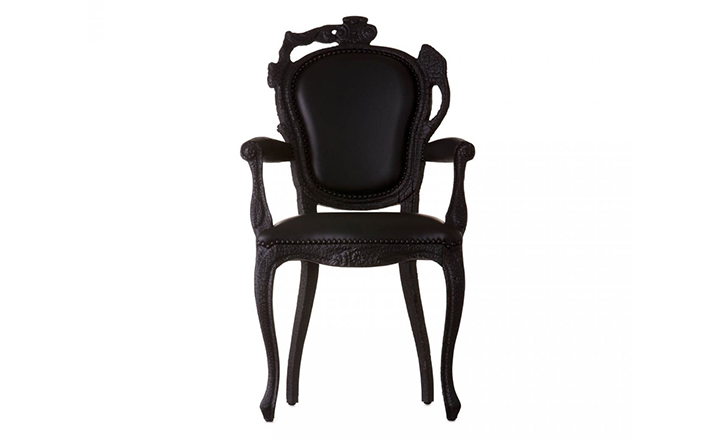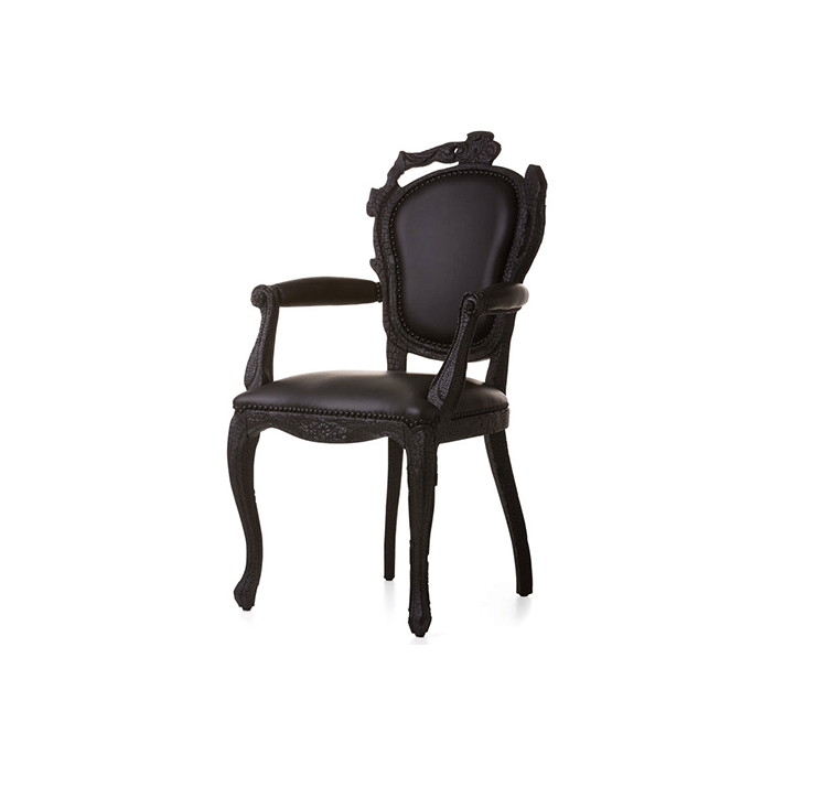 "Pieces of furniture are literally burned,after which they are preserved in a clear epoxy coating.The beauty and character of burned wood is now captured in a long lasting material, creating the strange sensation of sitting on burnt furniture.Maarten Baas is a Dutch designer who graduated from Design Academy Eindhoven in 1996.In 2000 he studied for several months at the Politecnico di Milano. In June 2002 he graduated at the Design Academy a series of burned furniture called "Smoke".Maarten is searching for the boundaries of design,without leaning on the regular"do's and don'ts".The Smoke series includes armchair,dining chair and chandelier. Each item from the Smoke series share the unfamiliar and untamed finish that is categorized by fire.Each piece is unique and may differ due to the process used for production.The smoke chair is upholstered in black leather and has a secret repair kit underneath the seat in case of emergencies."