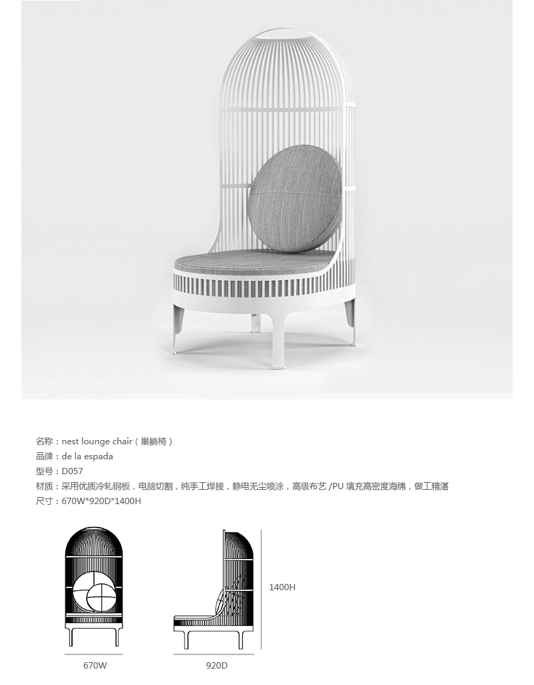 A unique seating experience.This lounge chair has a surrounding shell, making a cosy "nest" for the user. Nest keeps you close to your earliest memories.Whether placed in the middle of an immense desert or in a crowded lobby,Nest makes a statement.