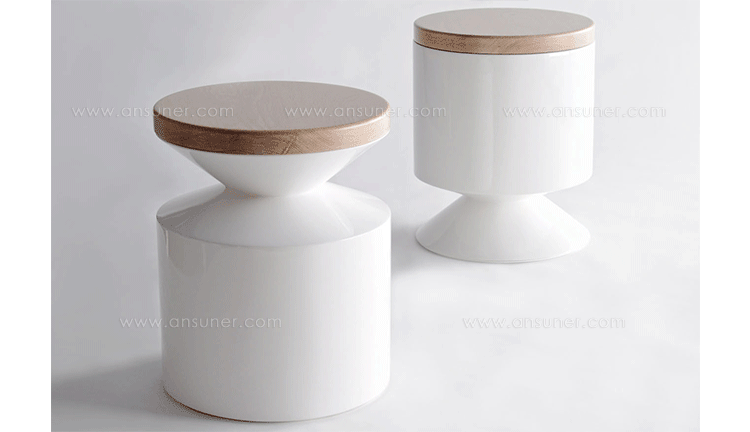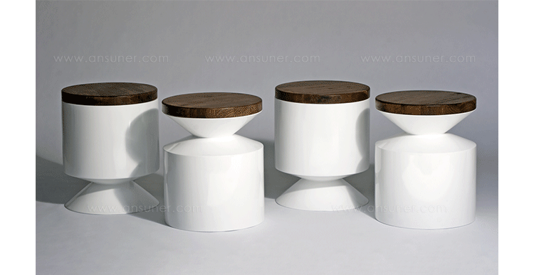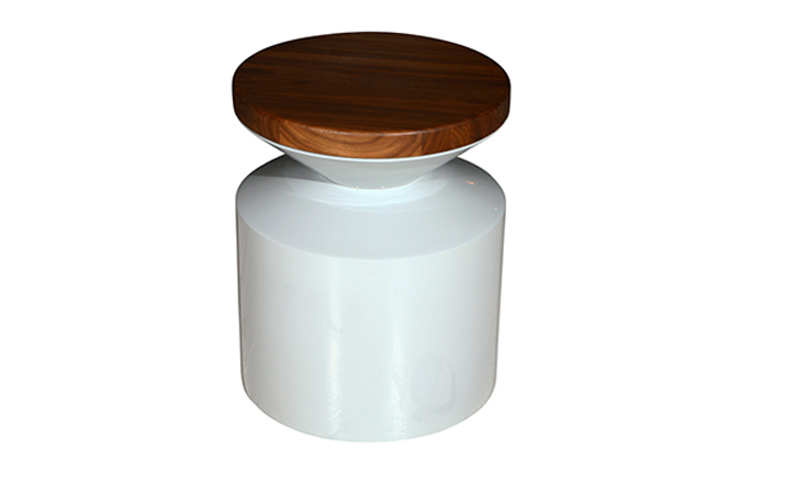 This versatile piece works interchangeably as a side table or stool.Made from a hand sanded fiberglass shell and finished with a high-end automotive polyurethane gloss finish,it is lightweight and durable.The 1.5 solid lumber top tempers the clean architectural form with its warm organic presence.The wooden lid can be sourced on either side at time of order. Indoor use only.