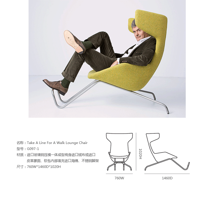 Walk Lounge Chair(行走椅)是由阿根廷著名设计师Alfredo Haberli设计的,无论放置在客厅、还是卧室、更或者公共空间,都非常的合适,并凸显经典时尚的气息。椅身的面料可做羊毛绒或者意皮,多种颜色任君选择。 针线走得直、流畅,缝线美观、均匀自然,线条优美。四星固定铝脚/不锈钢脚,表面光亮,拐弯处顺畅,光滑不留痕迹。内置玻璃钢都是采用出模一次成型,精心设计的座位、靠背连成一体,椅子可以360度旋转。外形独特,结构简单。现代,时尚,美观而且耐用。坐上去舒适,优雅而大方。从而达到减轻压力,消除疲劳的效果。
