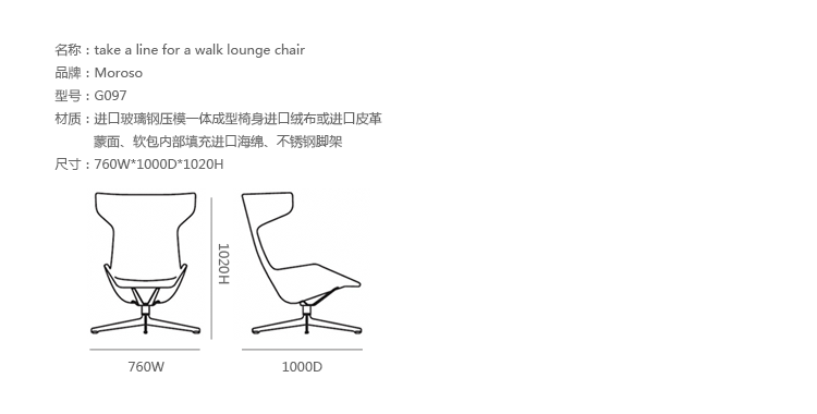 Walk Lounge Chair(行走椅)是由阿根廷著名设计师Alfredo Haberli设计的,无论放置在客厅、还是卧室、更或者公共空间,都非常的合适,并凸显经典时尚的气息。椅身的面料可做羊毛绒或者意皮,多种颜色任君选择。 针线走得直、流畅,缝线美观、均匀自然,线条优美。四星固定铝脚/不锈钢脚,表面光亮,拐弯处顺畅,光滑不留痕迹。内置玻璃钢都是采用出模一次成型,精心设计的座位、靠背连成一体,椅子可以360度旋转。外形独特,结构简单。现代,时尚,美观而且耐用。坐上去舒适,优雅而大方。从而达到减轻压力,消除疲劳的效果。